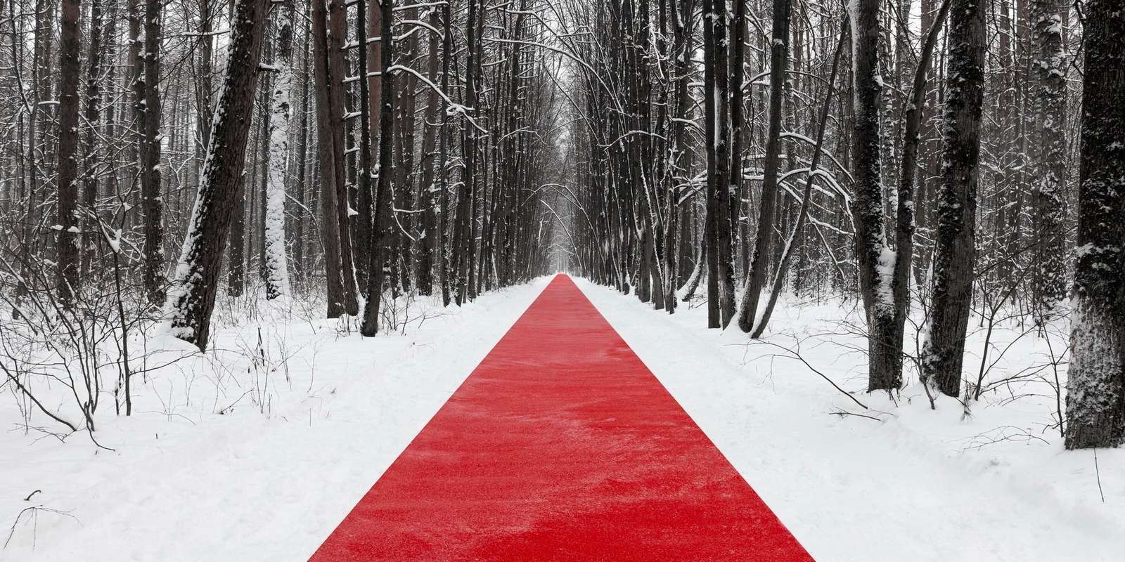 artist gregory orekhov has just completed his most recent work titled ‘nowhere’ in the malevich park of moscow, russia. his latest public art installation presents itself as a 250-meter-long red carpet made out of polypropylene, stretching across the snowy forest. surrounded by the vast natural landscape, the carpet seems like an endless line drawn on a white canvas.