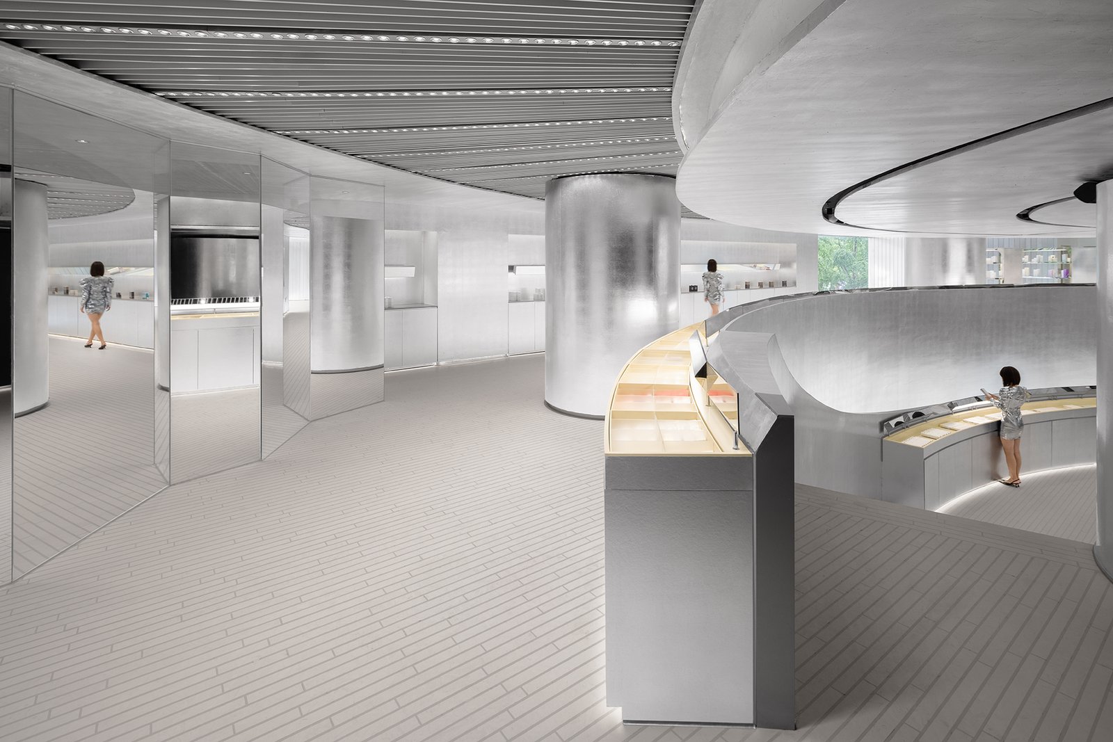 The entrance area at the first floor is decorated with flexible rotating mirrors. The pale yellow baked coating produces a sense of warmth and comfort in the space dominated by reflective, futuristic silver tone. Based on the brand’s concept, elements like scattered light strips, linear pendant lights, curved walls and large staircase narrate a story of exploring in the unknown and produce unique offline retail experiences.