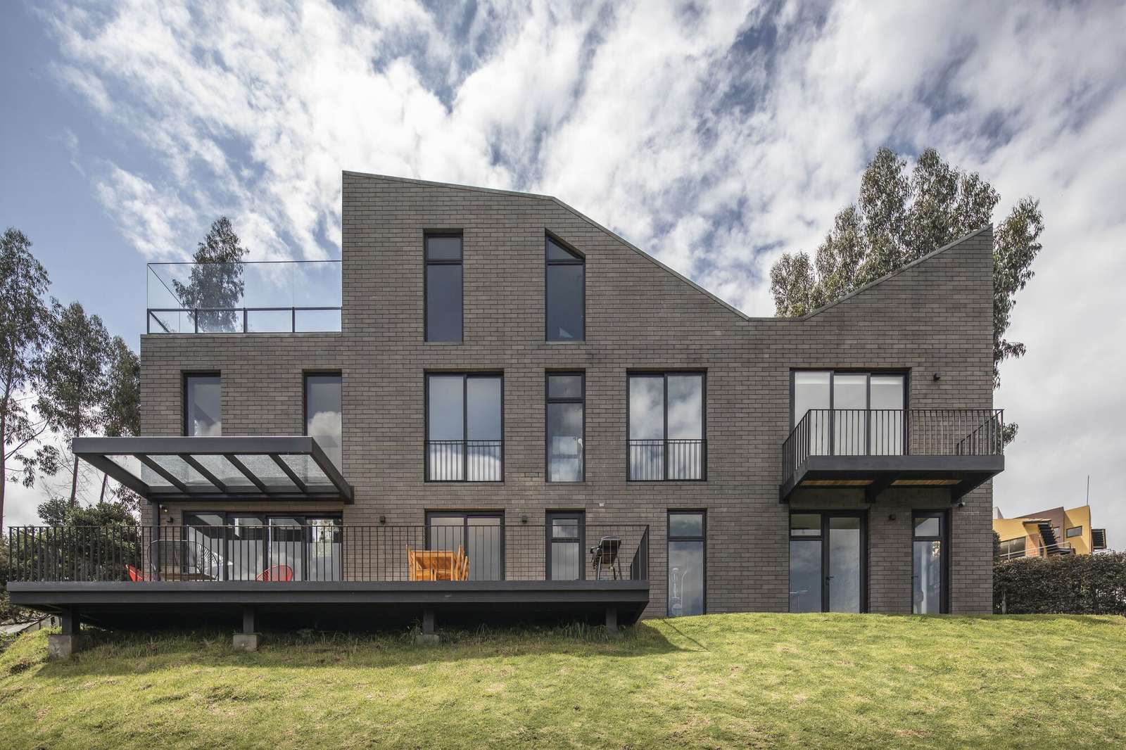 Its compact volume and black concrete block walls gain temperature slowly during the day and lose it little by little during the night, consistently responding to the area’s tropical, cold and rainy climate. We carefully study the position and geometry of each balcony, window, or terrace, connecting the house with the surrounding rural context.