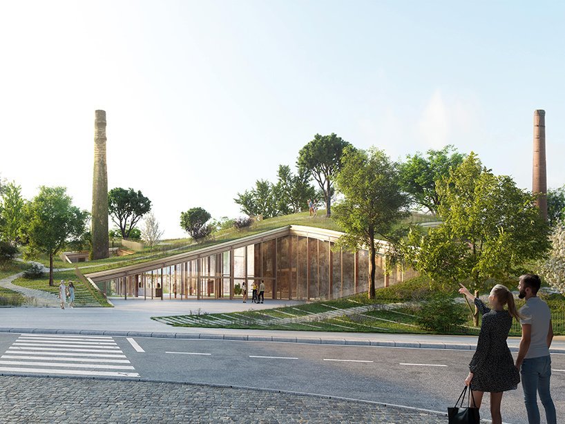 the final design aims to foster a harmonious relationship between the visitors and the surrounding landscape, honoring the history behind it. wandering the site, one will find reminiscences of the existing structures, monuments, and ruins of the old ceramic production halls: the old chimneys and furnaces pierce the park and museum, becoming part of it. meanwhile, the hilly roof becomes a topography and accessible for everyone, unfolding as a green veil.