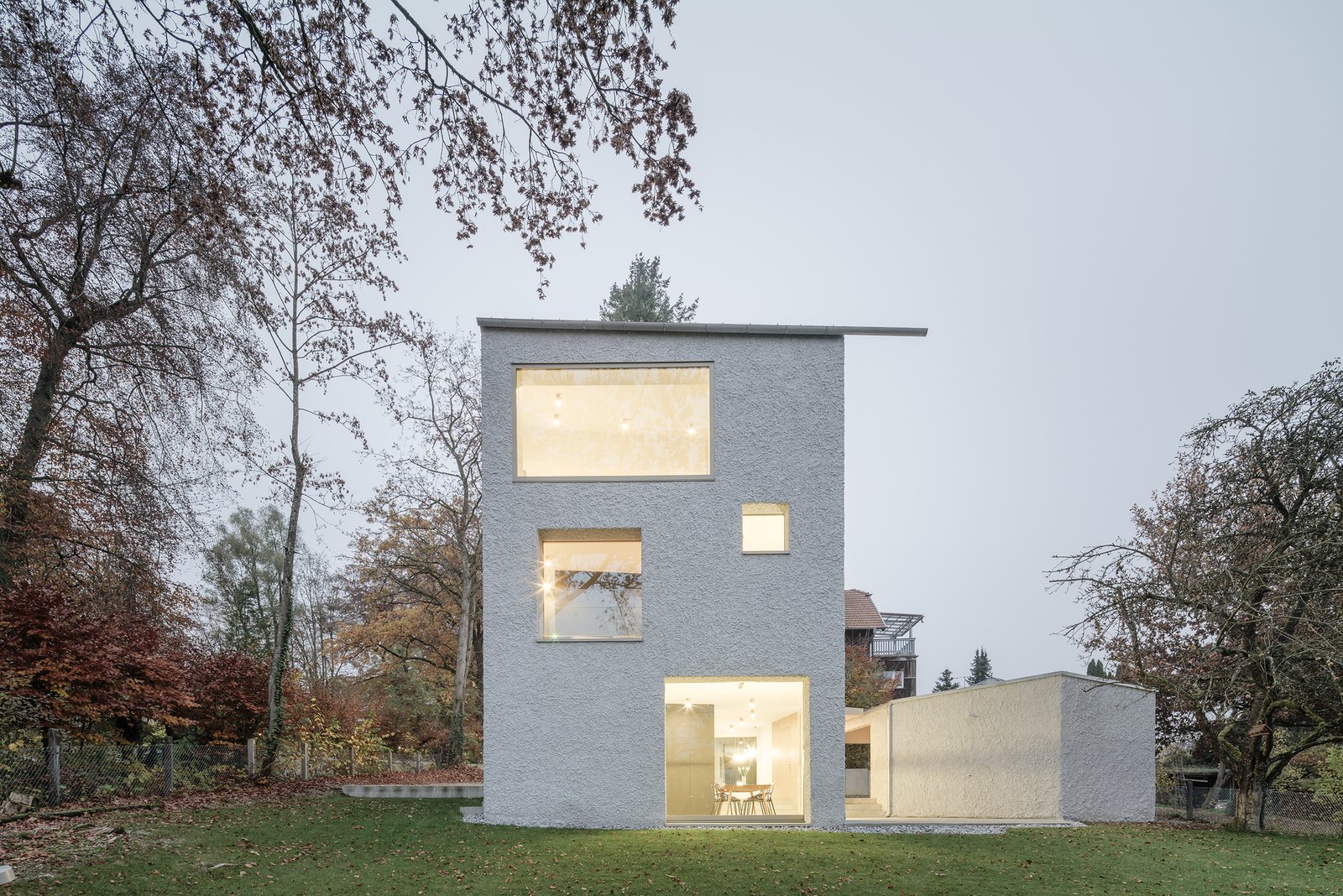 In order to take account of the tree population and to be able to experience the distant view of Andechs Abbey over Lake Ammersee, the building’s cubature, like the neighbouring buildings, rises up like a tower. To increase this feeling of height, three full floors with a living room on the top floor were planned. A large window offers a stunning view through the treetops over the Ammersee with Andechs Monastery and the Alps behind. The kitchen as the centre of the family’s daily is connected to the garden on the ground floor.