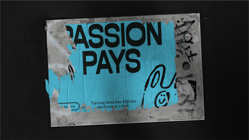 Complementing this is a stretched headline typeface paired with motivational messaging such as “Passion Pays” and “Sell Out Without Selling Out”, which speaks directly to creators considering the entrepreneurial leap.