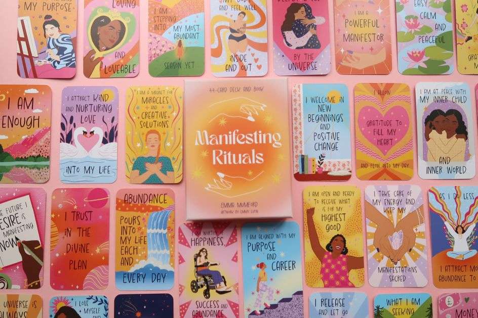 More eclectic but with a wider scope, Emmy’s commission from publisher Quercus to illustrate Emma Mumford’s Manifesting Rituals card deck led to a project that resonated with her spiritual side. In addition to 44 card illustrations, the requirements included the box art and illustrations for the instruction booklet. The topics included women, flowers, landscapes and patterns.