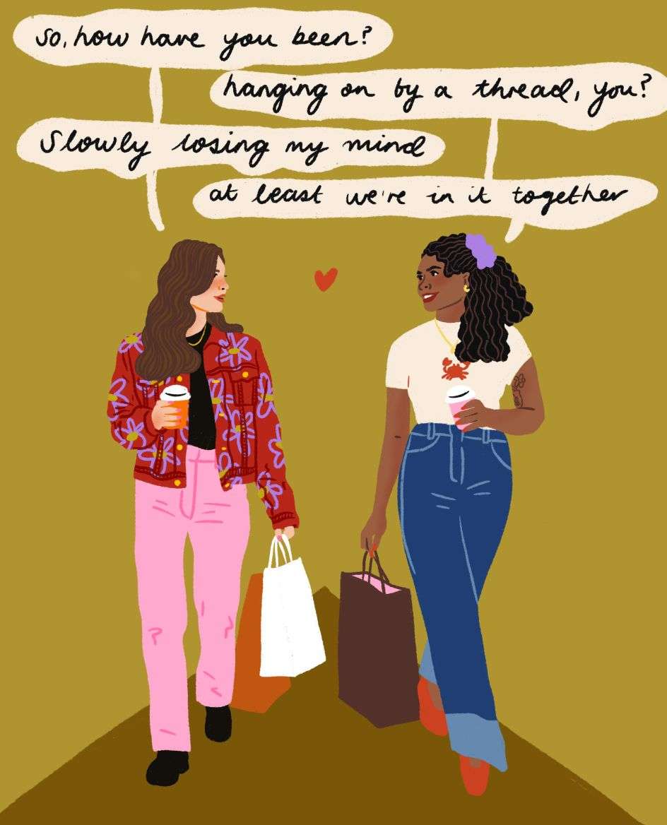 Emmy’s mission is to create art that is relatable and fun and for people to be able to imagine themselves in the images. She does so through a female lens; friendship is a strong theme in her work, and she’ll take her viewers from extreme highs to extreme lows and back again. That’s life, and she captures it from the world around her in pieces that max out on colour and pattern – everything with a hand-drawn vibe.