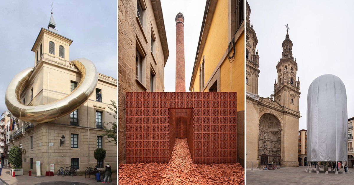 concéntrico is an international architecture and design festival taking place in logroño, spain. founded by architect, curator and researcher javier peña ibáñez, the festival invites visitors to explore the city through installations, encounters, activities, and exhibitions that discuss public space and places of coexistence. several architecture studios, artists and designers have participated with site-specific installations over the past seven years, including PALMA, who, together with HANGHAR, inserted a temporary brick pavilion in an old factory’s narrow passage; plastique fantastique, who put a gigantic inflatable gold ring on the instituto esudios riojanos headquarters; and benedetto bufalino, who inserted a wooden terrace directly above three vehicles that were parked on the street.