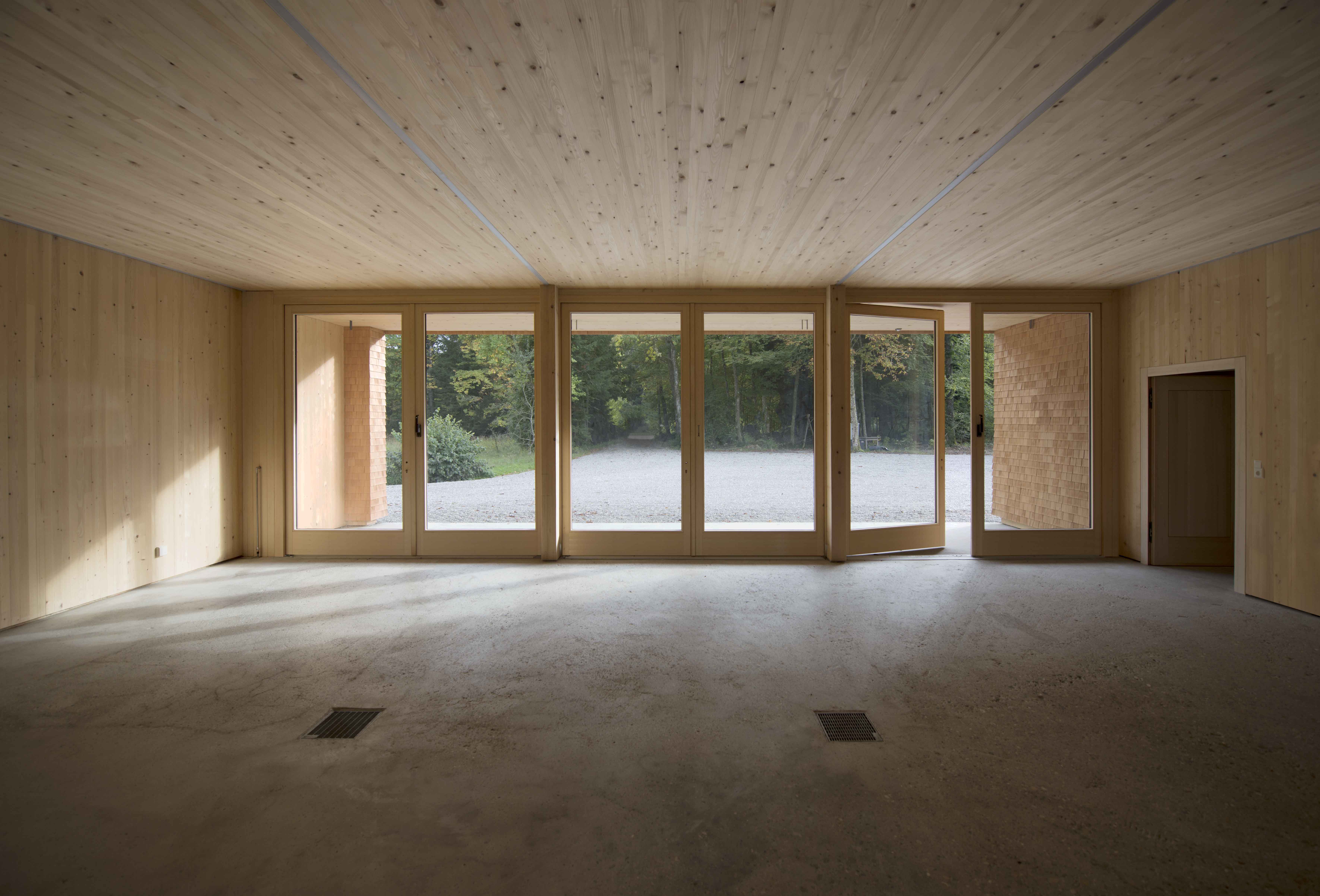 Wände und Decken sind aus Weißtannendielen zu Massiven Elementen gefügt، der Dachstuhl ist in konventioneller Weise abgebunden. Die Außenwände، das Dach und der Kamin sind mit Douglasienschindeln verkleidet worden. Die Stämme sind zu diesem Zwecke an den Schindelmacher Philipp Herburger in Lingenau geliefert worden، der Allgäuer Schindeler Libor Janca hat sie am Gebäude angebracht ..