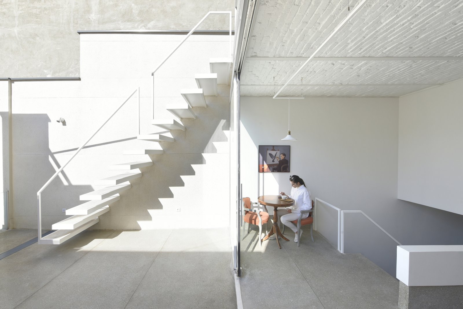 To the bottom was established a limit of construction to 100 cm of the wall already existing in the later side of the store, that both on the ground as on the second floor, which made possible the creation of a winter garden on the first floor, that communicates with the second floor and with the terrace, this purposeful spacing created a connection of the floors that through skylights chimneys bring natural light and ventilation to the back of the Gallery, a place that doesn’t allow the installation of windows and was unattractive.
