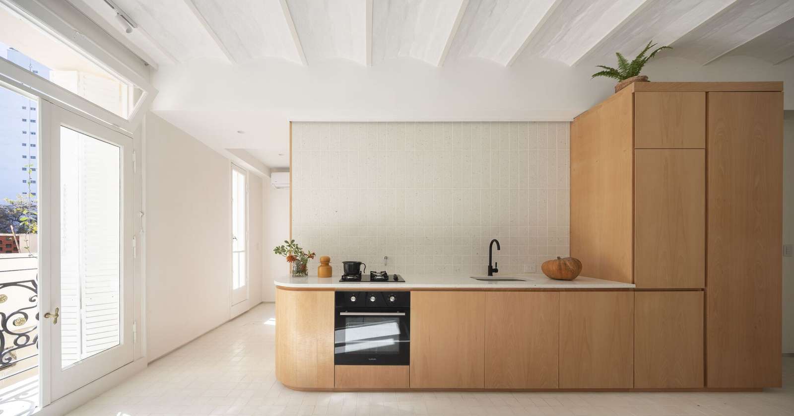 The layout was originally fragmented into three small rooms with poor access to sunlight and interrupted airflow. Hence, in order to create an open and luminous space, the non-load-bearing walls were demolished and the hidden vault ceiling was revealed and restored. In the center of the space, a seamless volume compacts the program allowing circulation around and providing a particular response to each side. Towards the living area, it opens up as an integrated kitchen while on the flip side it contains the bed and the bathroom.