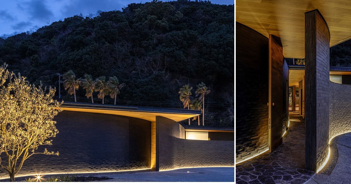 vernacular meets modern in the ‘river sea’ home as three separate buildings are fused through a mystical brick path. on awaji island in japan, extending right to the mouth of the river, the one-story private residence by kawazoe junichiro architects is designed as to blend into the surroundings by suppressing the impact of the built. the three separate functional parts are divided into the entrance building, the guest area and the main house. as these are kept apart by the courtyard, the curved path runs through to connect the spaces.