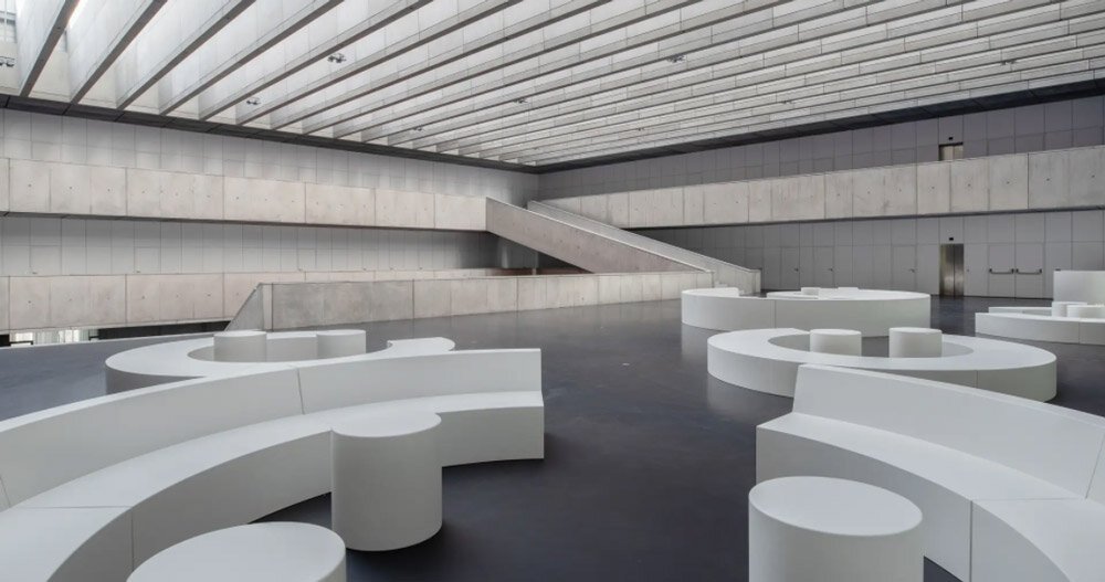 prevailing materials in the interior are exposed concrete combined with a fine metal ceiling mesh, black floor screed and white wooden elements and furniture. the space is dominated by a variably set seating furniture in orange.