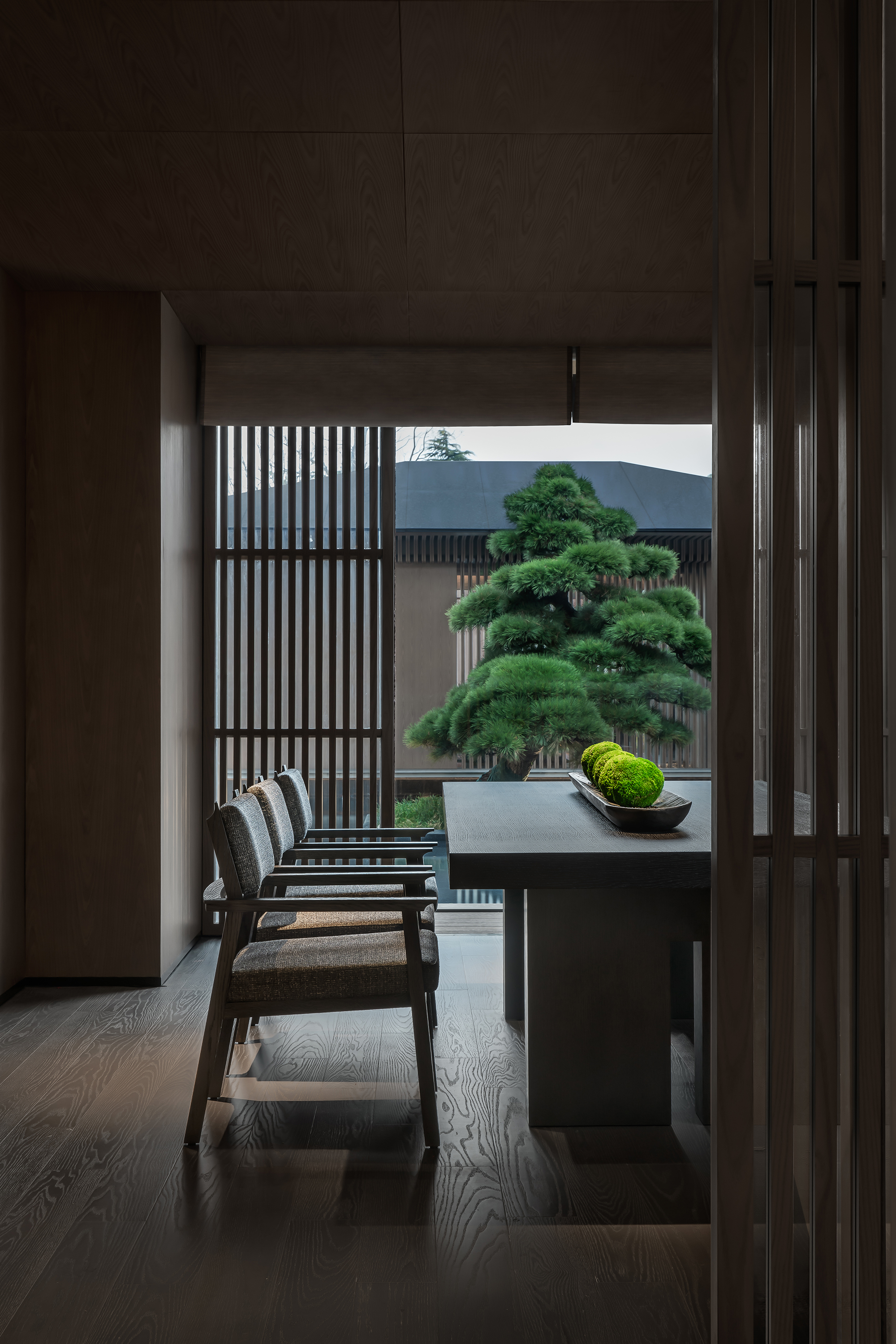 The water seems still, but actually flows slowly, evoking infinite imagination.Integration between the interior and outdoorsThe design adopted simple materials, abandoned sophisticated details and artificial carving. The wooden structural “boxes” are topped with flat eaves to blend into nature with a low profile.The wooden tables and chairs, tatami rooms, characteristic Japanese-style wallpapers and textured wall finishes create unique visual experiences, and reveal the traditional, classy elegance of the Japanese restaurant.The spatial design does not need any gorgeous decoration, as door and window frames bring in outdoor landscape, presenting varying views throughout the year.The slender skylight is a design highlight.