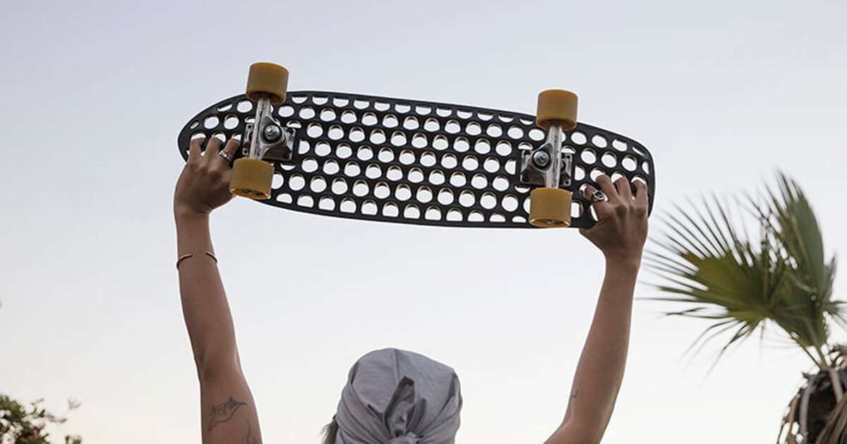 lander recycles discarded ocean fishing nets into quirky perforated skateboards