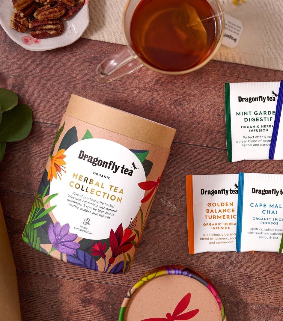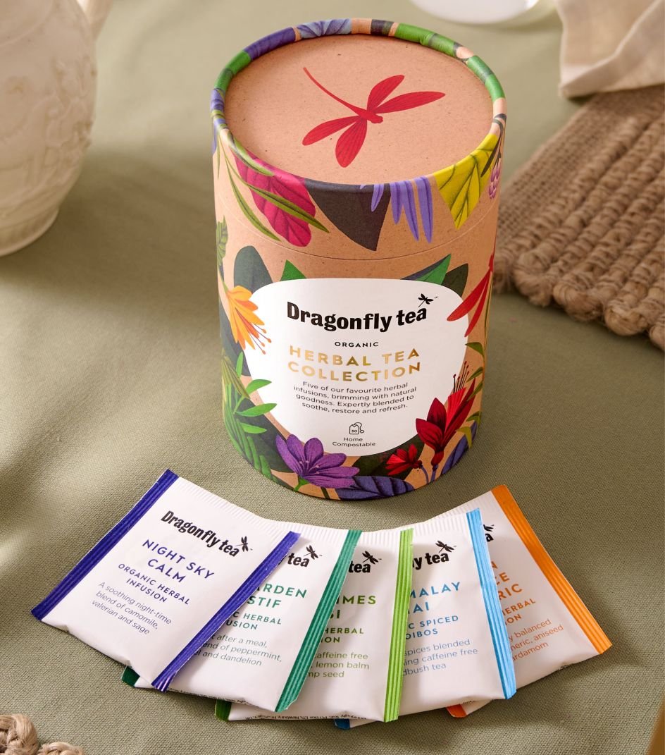 Their new Herbal Tea Collection comes together in a cylindrical tube comprising five of Dragonfly’s most-loved infusions, each one wrapped in richly illustrated, recyclable packaging that celebrates the natural world.
