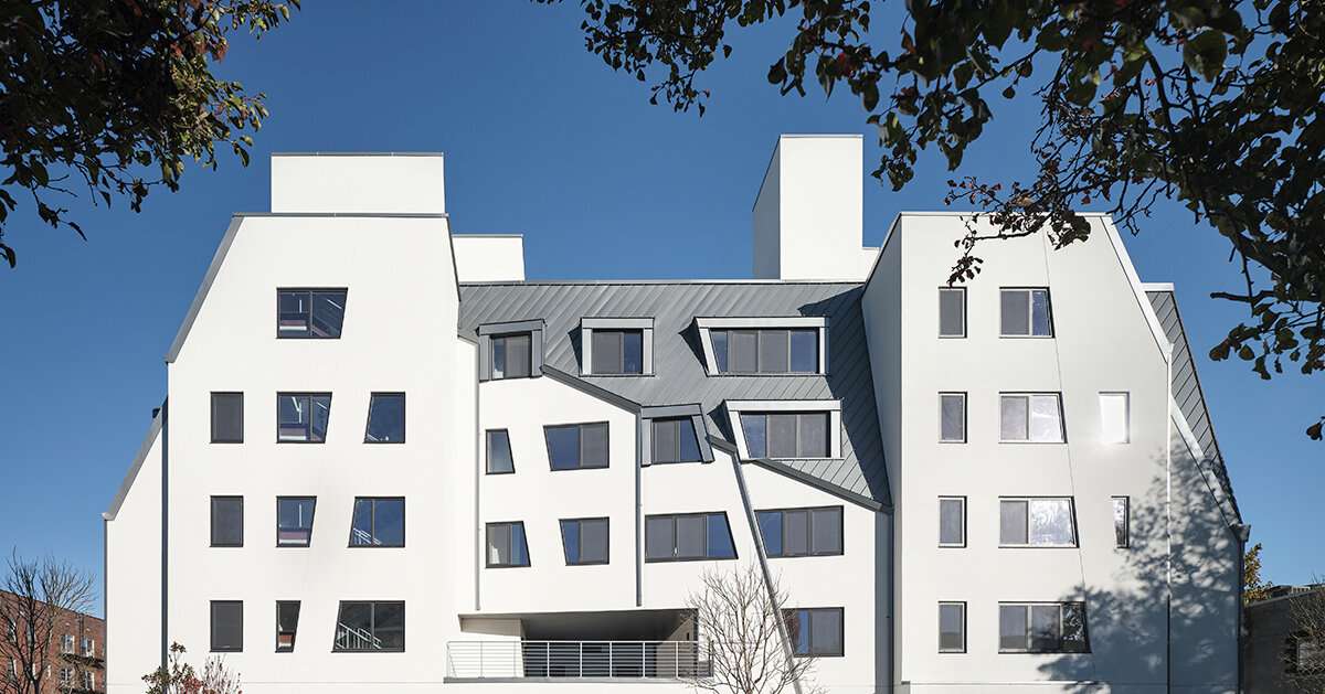 Libeskind‘s design for the five-story building features a simple white exterior with vertical geometric facets that elegantly cascade down the façade and a sloping metal roof with dormer windows on the upper floors. The central open space is designed as a landscaped courtyard for residents, and large windows in units and hallways, along with multiple outdoor spaces to bring in ample natural light.