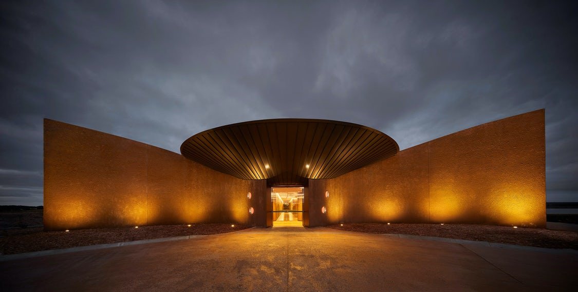 Positioned on the crest of a hill, the building can be experienced from various sightlines, emerging above the trees as golfers navigate the course. In response to its coastal conditions and the prevailing winds that come off Bass Strait, the building is firmly anchored to its site. Instilling extreme robustness, the structure is grounded by a series of curved blade walls embedded in the landscape, finished in a highly textured render.