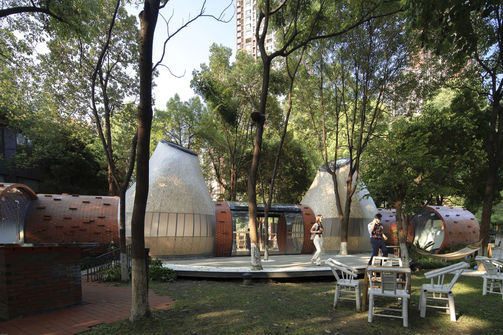 Light interventions and environment. Between an industrial site and a dense forest, the initial design attitude is to build a familiar but different context with minimal material interventions and light construction measures. The functional form, the choice of materials, the tectonic measures, and the resulting simple forms all revolve around a strategy of light intervention. The barrel-shaped units formed by the lap of the bricks in response to the forces of the arches enclose the linear path space; the vesicular membrane masses supported by the natural and lively form of the handmade bamboo weaving link the brick barrel-shaped units, becoming amplified nodal spaces. The barrel-shaped units allude to the unique “chimney” element of the industrial plant area and reproduce the memories of the plant site through the cylindrical shape of the “chimney”, making the design of the project in line with the original culture of the Eastern Suburbs Industrial Park. The cylinder represents the memory of the factory’s chimney and the rebirth of the new space, a merging of the old and the new, reassembled and interpreted as a tribute to the past and a yearning for positive rebirth. The building is enriched by an elevated ‘tray’, which makes the building lighter and more dynamic within the site. The preservation of the site’s native trees naturally creates a spatial atmosphere of the old Chengdu courtyard culture, linking it to modern life and ultimately demonstrating a new fashionable aesthetic space in the present.