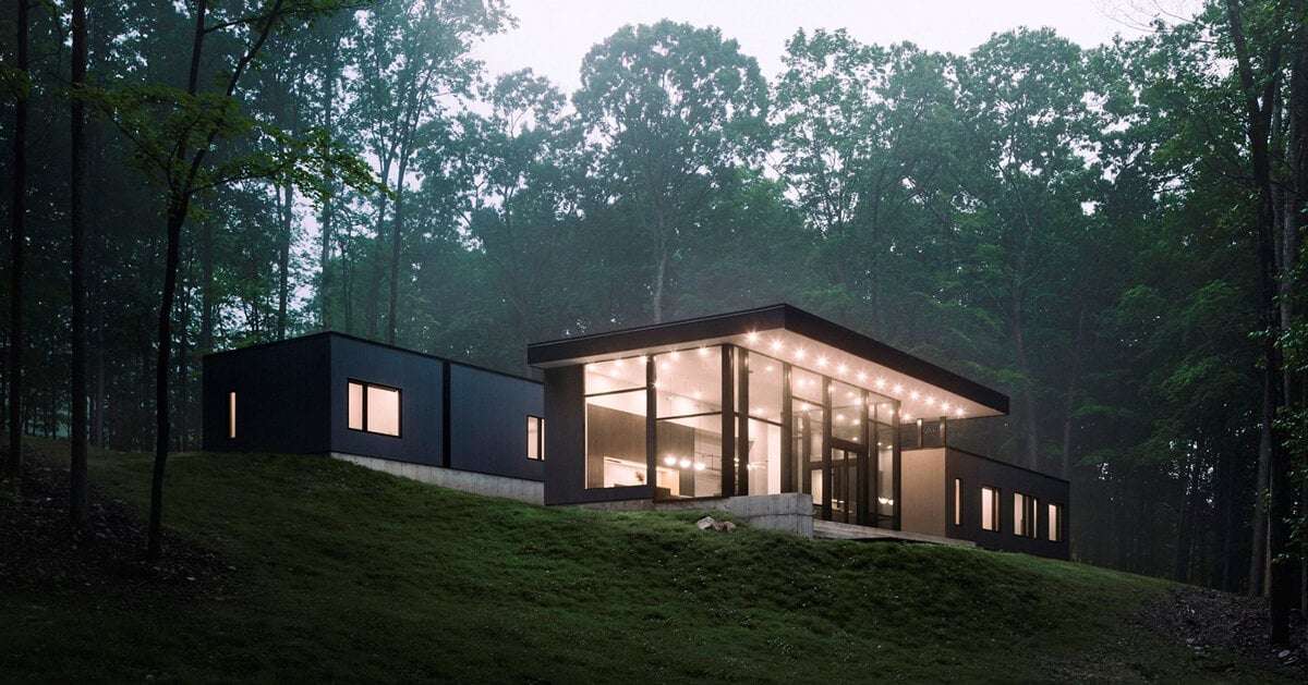 monochrome wood-clad house by studio mm nestles along sloped site in upstate new york