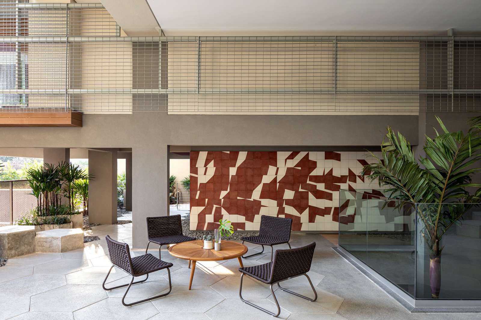 Inside the building, the visitor is greeted by the covered elevated square, which was articulated to be integrated into other environments, such as modernist courtyards. The environment is complemented by the panel of the artist Fabio Flaksajuda and the equipment was designed by the office Superlimão, a long partnership in FGMF, responsible for the construction of the environments of the common areas. In addition to these common spaces, MOOU has leisure areas with a swimming pool, a gourmet area, and comfortable social environments.