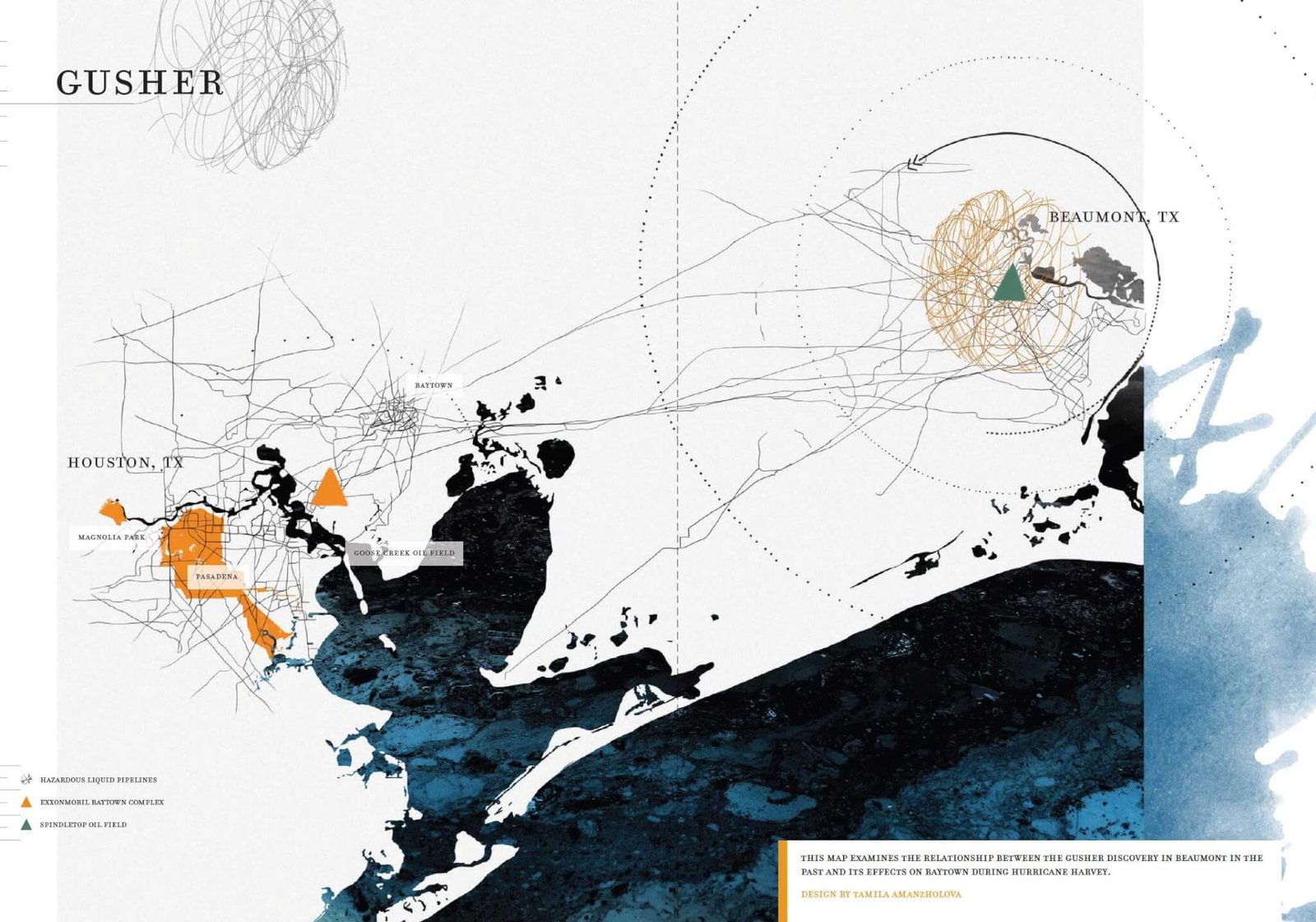For Houston, a city separated from the coast and not properly “coastal,” the topics of concern in the national conversation are either “energy markets” or “no zoning.” Ocean rise does not come to mind—Houston is 50 feet above it all! But since it is linked by a long waterway and a delta of bayous that unite in frequent deluges—alternately the result of intensive rainfall or surges up from the Gulf of Mexico—waters have and will come. The bayous have been expertly reconfigured and buried; they now serve as paved runoffs. In addition, the wealthier parts of the large agglomerations are hidden under a zoohemic tree canopy, which covers the wet prairie. Yet almost as a surprise, hurricanes sweep water across the expanse, which invites the actual intentions of More City than Water: A Houston Flood Atlas. When those monsters rage, the city’s inhabitants rise above.