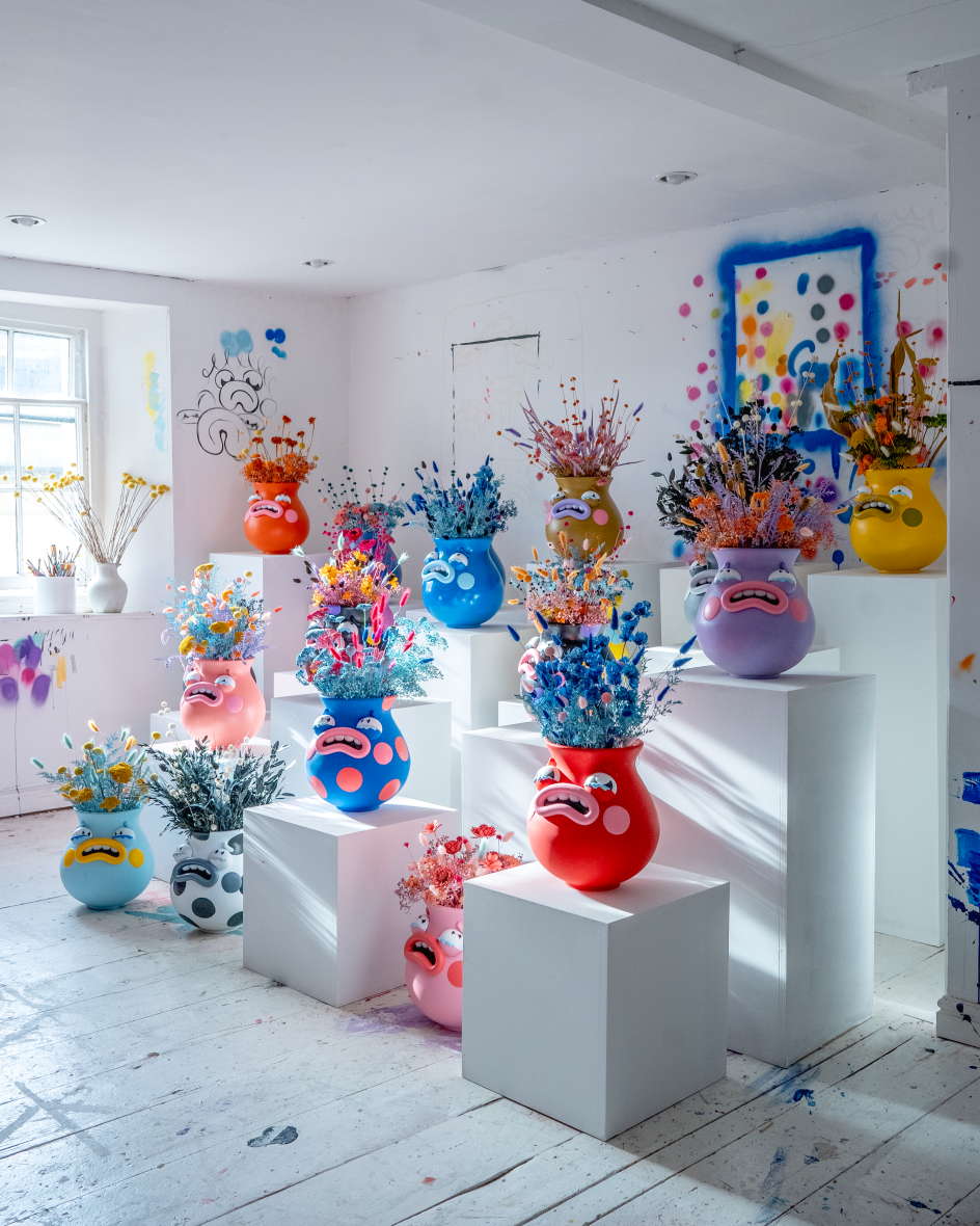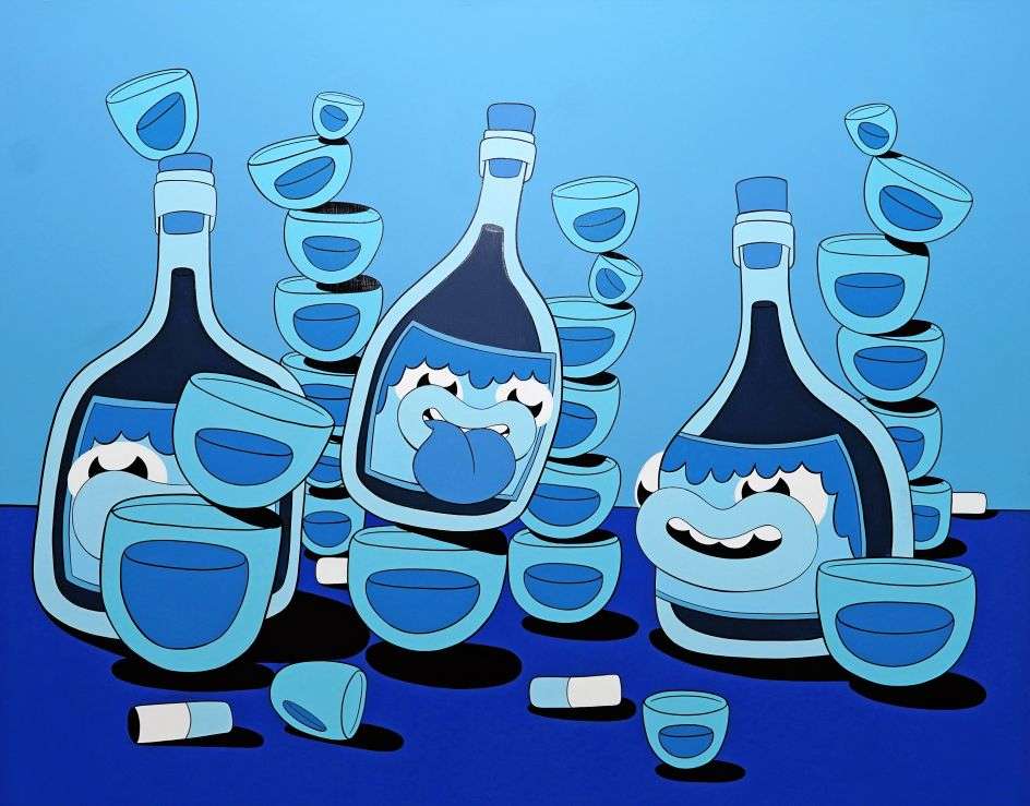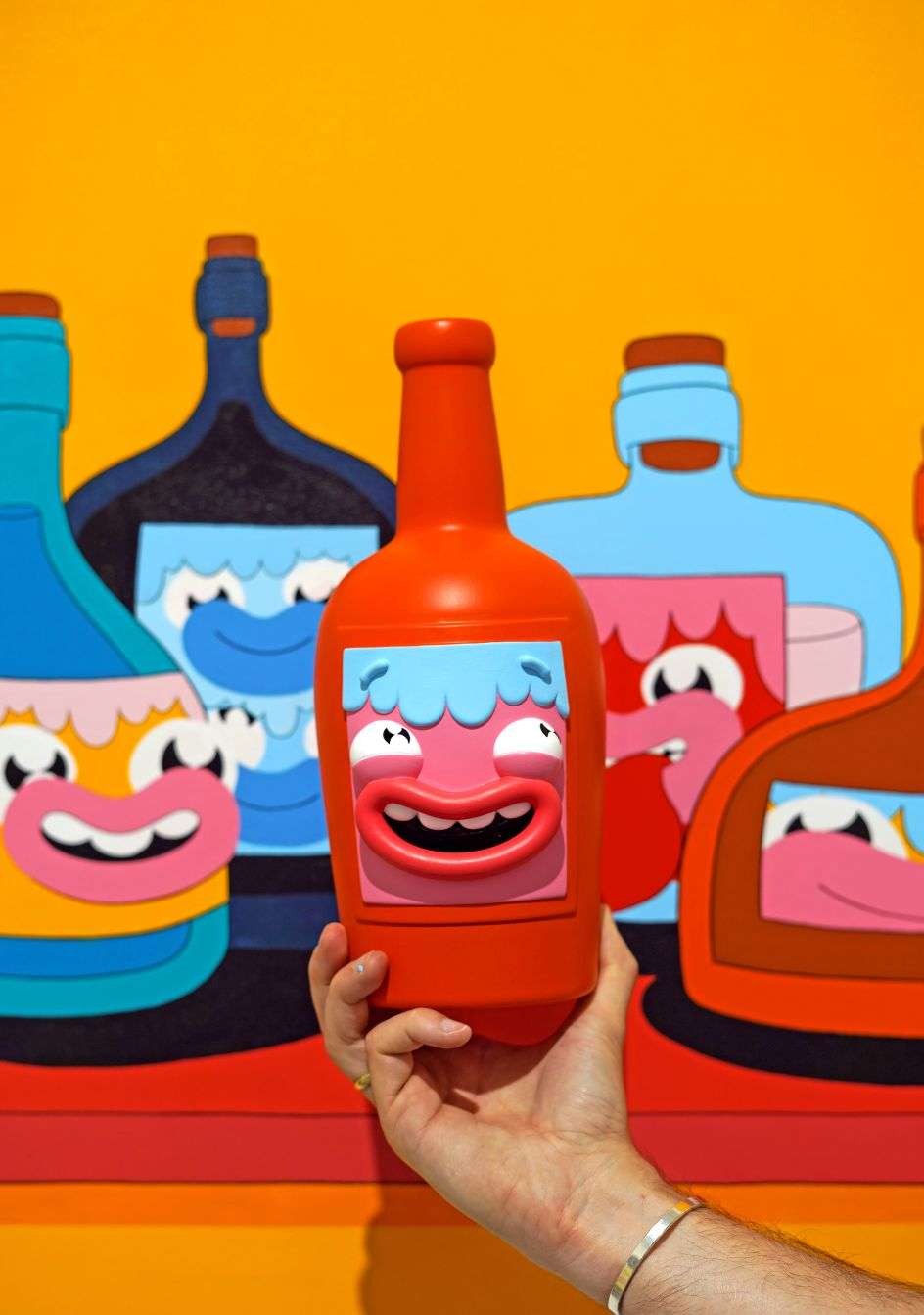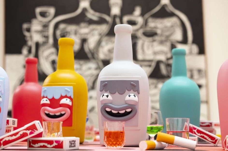 His most recent exhibition – CHEERS, held in London this September – is a case in point. The works, both painted and sculpted, explore the theme of social drinking. Bottle characters feature heavily across the collection, and while some are as exuberant as a Friday night drinker, others express the flip side of the indulgence.
