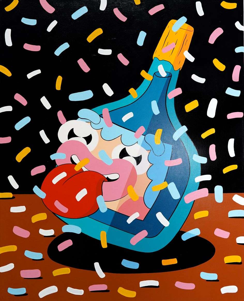 MrCallaby’s universe of anthropomorphic characters isn’t confined to planet booze. Every year, he takes on a new theme, which he explores in detail through sketches. When the concept and collection begin to take form, he plans and meticulously paints his canvases with eight layers of acrylic for those super-saturated, popping colours.