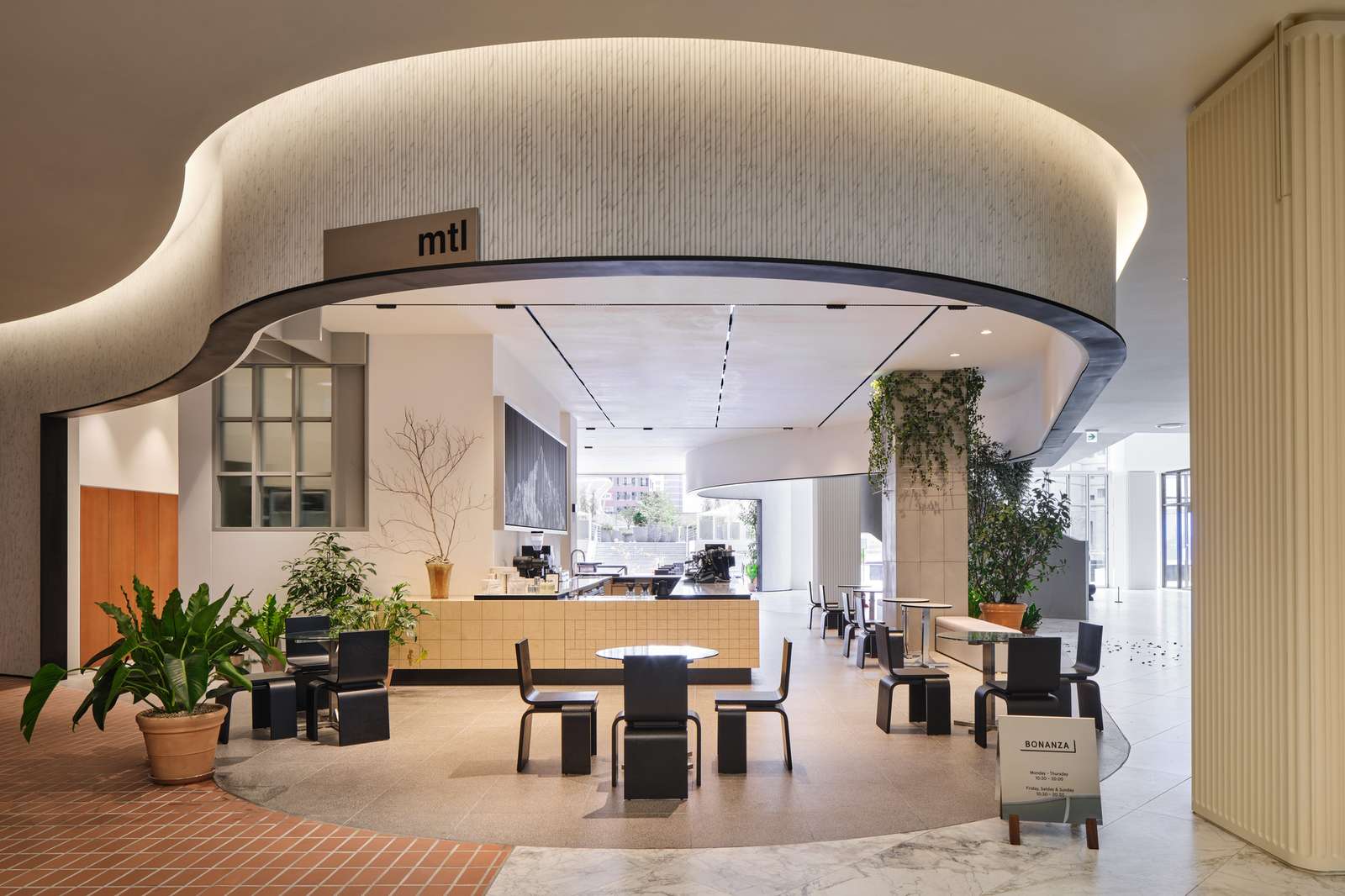 Diversity. Furniture placed in space takes various forms to function appropriately in each program, such as tables with hooks to hang items purchased at department stores, spacious bench seats reminiscent of hotel lounges, and high tables by windows for efficient communication and education. In addition, the trivision installed behind the coffee bar is a frame that is continuously converted into different images and reflects the direction of mtl, which pursues various values such as veganism, eco-friendliness, and minimal life.