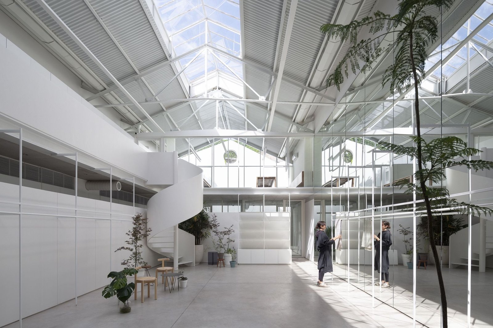 The central design axes that structured the project unfolded out of the need for all the environments to receive natural light and for all of them to coexist with the exterior space in some way, guaranteeing the greatest possible space for each program. Based on this search, a new courtyard was created towards the back of the property, leaving the warehouse configured between two courtyards that ventilate and illuminate the programs that delimit it. The warehouse was stripped of its interior elements to expose its bare structure. Light colors were chosen in all the spaces to achieve a feeling of spaciousness. The mirror coating on the dividing wall enhances the feeling of spaciousness and maximizes natural light.