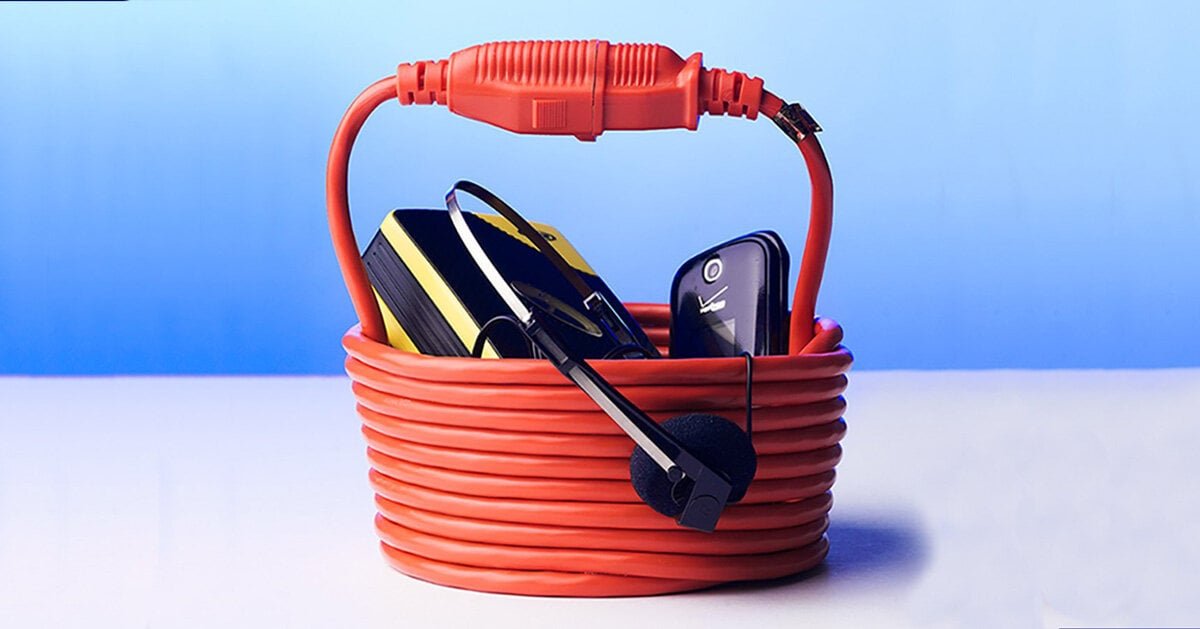nik bentel wraps a single 25 ft electric cord into a statement bucket-shaped handbag