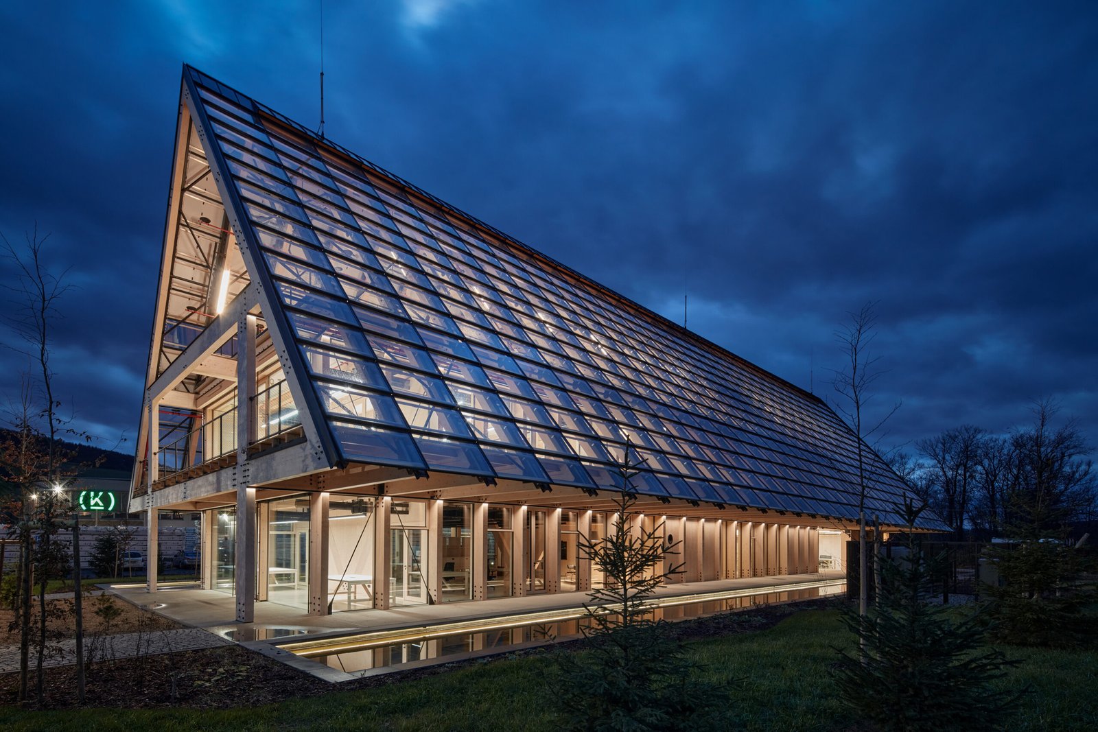 Built entirely from timber sourced and processed on-site, the Kloboucká Lesní Headquarters demonstrates the possibilities of locally driven, sustainable construction. A modular glulam frame defines the structure, creating a flexible, open interior while allowing for future adaptability. The exposed skeleton runs through the entire building, its rhythm reinforcing both the logic of the structure and the company’s transparent approach to forestry. A solar power plant is integrated into the roof, providing energy for both the headquarters and the adjacent production facility. Inside, natural materials and visible construction methods emphasize durability and resource efficiency, shaping a workplace that aligns with the company’s long-term vision of responsible timber production and ecological stewardship.