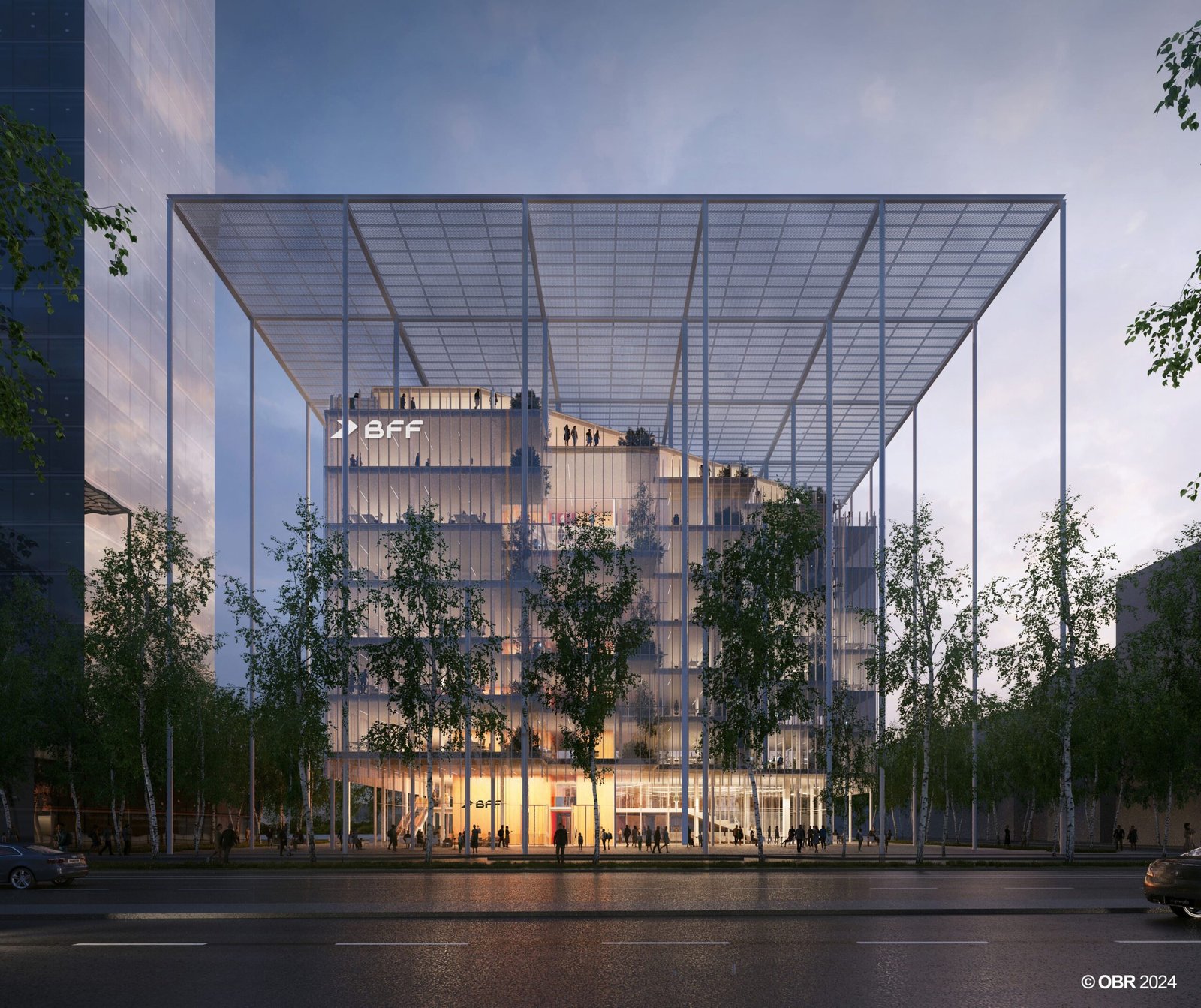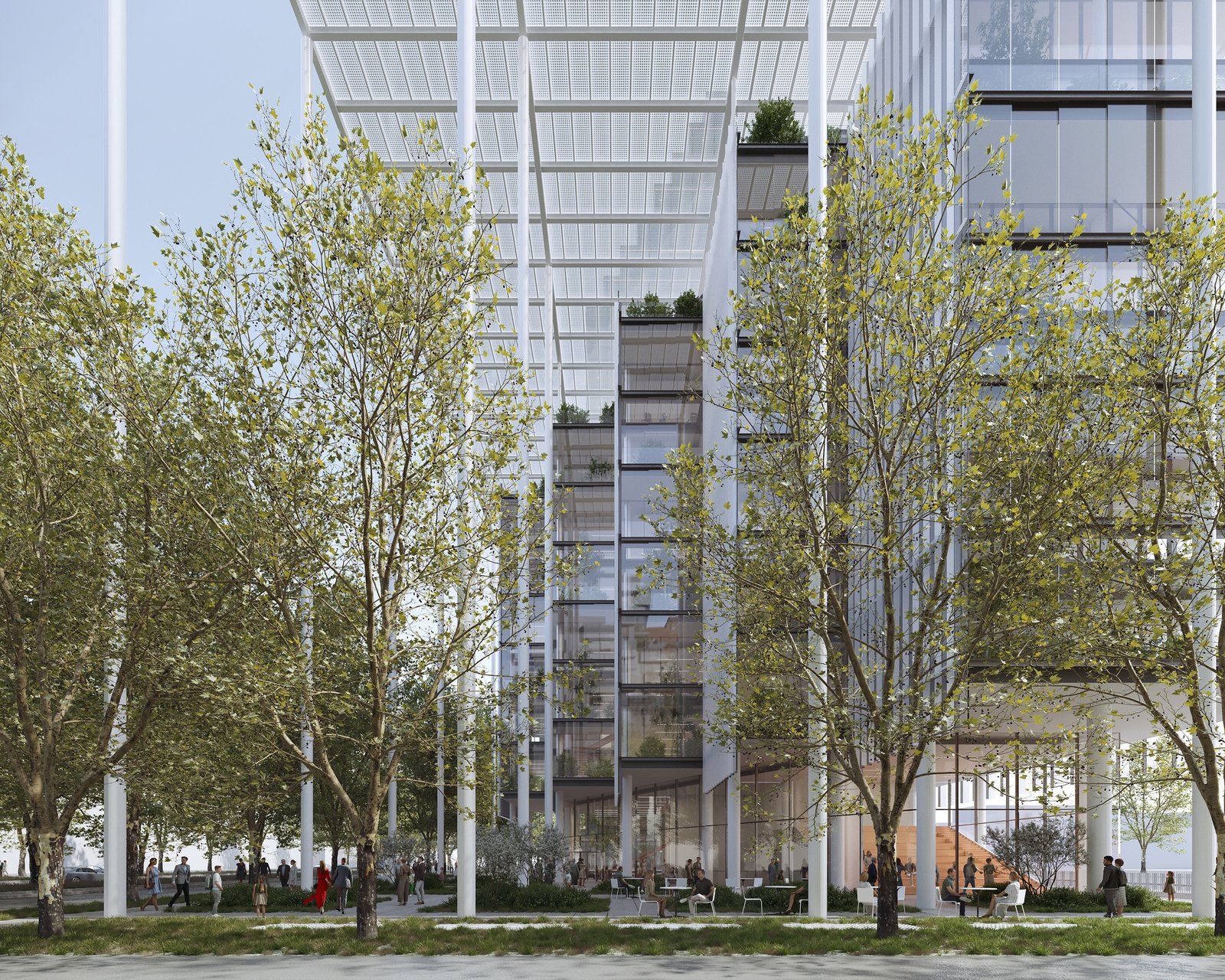 Casa BFF’s defining feature is its towering 130-foot-tall (40-meter-high) portico, a structural frame that extends the building’s presence beyond its footprint to shape a new public piazza. Above, a vast solar canopy forms a recognizable silhouette in Milan’s cityscape while serving both as a protective shelter and an energy-generating system. Supported by a visible framework, this element integrates 24,755 square feet (2,300 square meters) of photovoltaic panels, producing 360 Megawatt hours per year. The open structural grid reinforces the project’s civic character, creating a permeable threshold between private offices and public space. Inside, flexible workspaces maintain a connection to the outdoors, framed by the structural logic that defines the building’s identity.