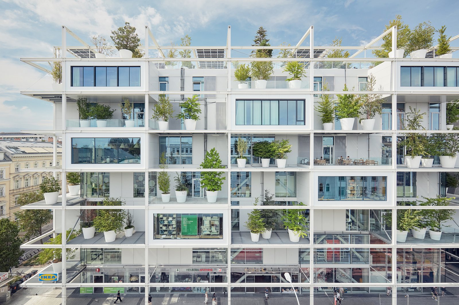 Designed as a car-free urban landmark, this IKEA store in Vienna rethinks the role of retail by prioritizing public space, greenery and adaptability. The multi-use building integrates a furniture store at its core, while a hostel on the upper floors and a public rooftop terrace expand its function beyond shopping. A deep structural grid, reminiscent of the brand’s iconic shelving systems, wraps around the façade—offering shade, terraces, and space for 160 trees that help cool the urban environment. Inside, exposed infrastructure and a flexible 33-by-33-foot (10-by-10-meter) column grid create an open, adaptable layout. A central void visually connects floors, drawing visitors upwards via escalators. By combining good design, sustainability and community access, the project embodies IKEA’s goal of being “a good neighbor.”