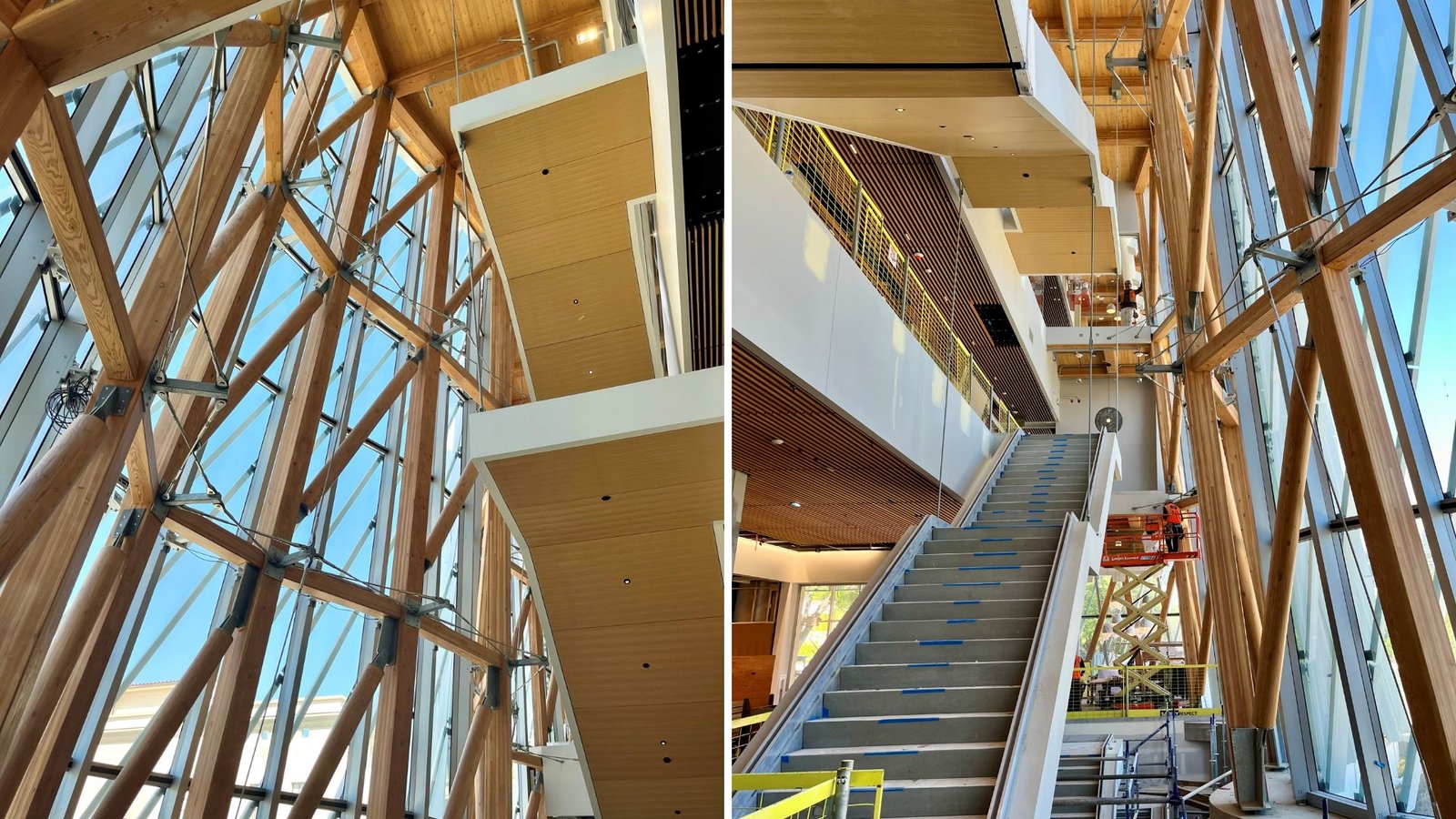 The Resnick Sustainability Center at Caltech puts its structure on display, making mass timber a defining feature of both its construction and identity. A soaring timber-framed atrium forms the building’s core, with a grid shell supporting the glass curtain wall. This exposed system allows natural light to reach deep into the interior while aluminum fins control glare and heat. Cross-laminated timber and steel define key spaces, reinforcing a clear and expressive structural language. More than a research facility, the building reflects the sustainability principles it supports, using renewable materials to shape a setting where scientists and students push the boundaries of environmental innovation.