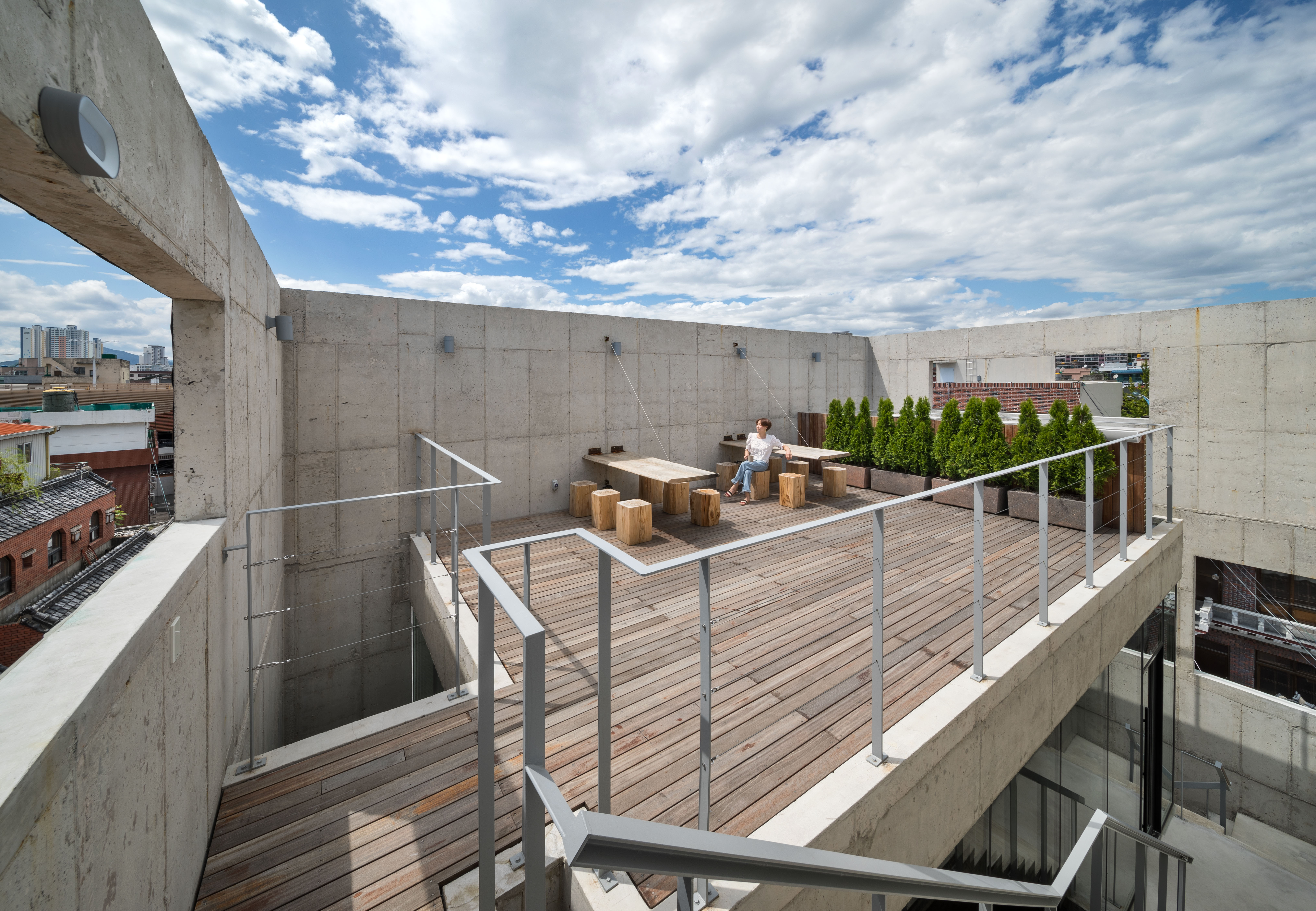 The outdoor stairs and the indoor spaces were separated with a 300mm-wide gap and the in-between spaces connected vertically. Thus, the occupants within the glasswalls and the walkers moving around up and down floor to floor always share the same time.The envelope was separated from the inner structure, lest this commercial building shouldinterfere with the surrounding context of houses.