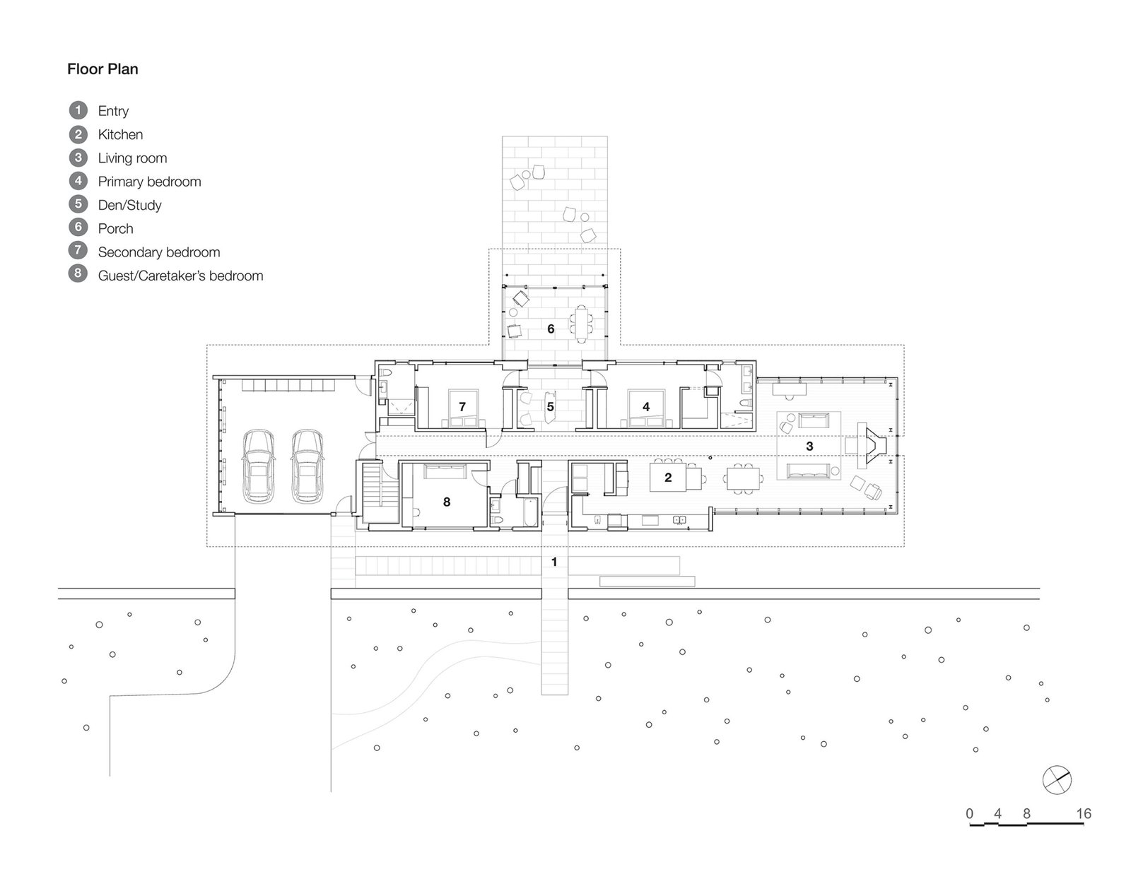 Built for longtime clients preparing to age in place with Alzheimer’s, this home prioritizes clarity, safety and connection to nature. A simple cross-shaped layout helps with orientation and memory by offering clear, predictable pathways. Wide hallways, accessible bathrooms and same-level entry anticipate future mobility challenges. A 92-foot (28-meter) skylight and expansive windows flood the interiors with daylight, aiding wayfinding and stabilizing circadian rhythms. Natural materials like reclaimed pine and bluestone create a low-contrast, familiar environment, reducing visual confusion. Custom door handles and lowered counters offer easier grip and access, supporting physical independence as needs change over time.