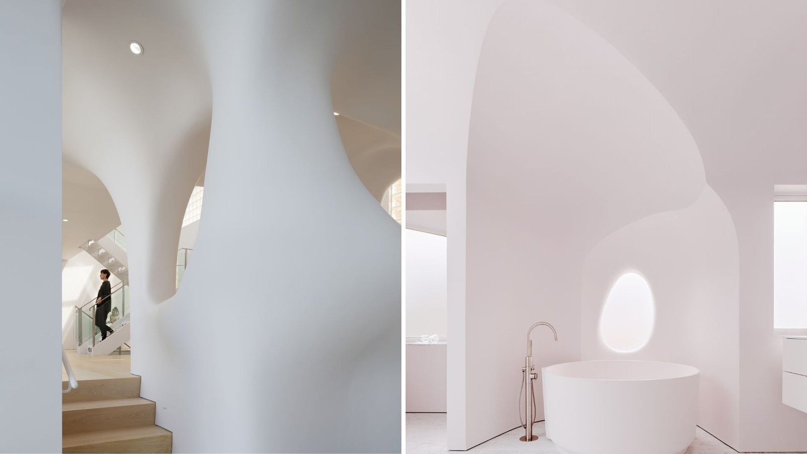 Softie transforms a strict Modernist house into a place of private release, responding to a client’s wish for a free, light and untethered environment. Rather than reworking the structure, the architects introduced a series of soft, cloud-like forms that drift through the home. These interventions dissolve the rigid grid with curved entries, softened stairs and floating shapes that blur traditional spatial boundaries.