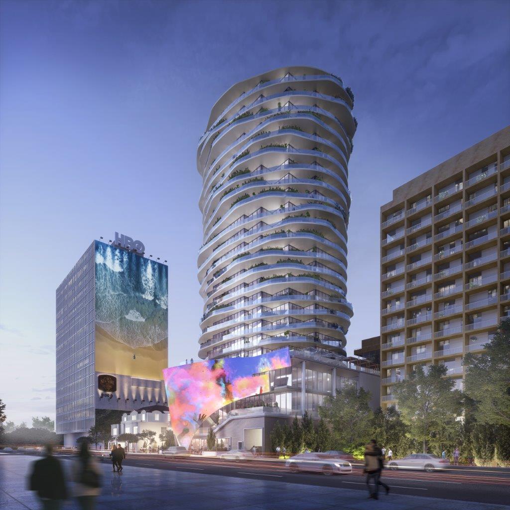 Tower on Sunset – The project is a 24-story mixed-use tower with residential units (109 market-rate, 47 inclusionary), amenities, outdoor space, office, retail/restaurant, and an interactive digital sign. Building on the culture and history of Sunset Blvd., the Tower on Sunset was formed around iconic views of West Hollywood and Los Angeles. These view corridors define the tower and generate the sculptural nature of its curving floor plates. The design embraces the history of one of L.A.’s most iconic streets and reimagines the tower typology to capture the essence of the city itself. The project site also contains the historic Crosby building, Bing Crosby’s former office, designed by Ronald J. Webb in 1937. This historic California landmark will be relocated on-site. The project is currently in the Entitlement process in West Hollywood and continues to evolve with input from the city and its residents.