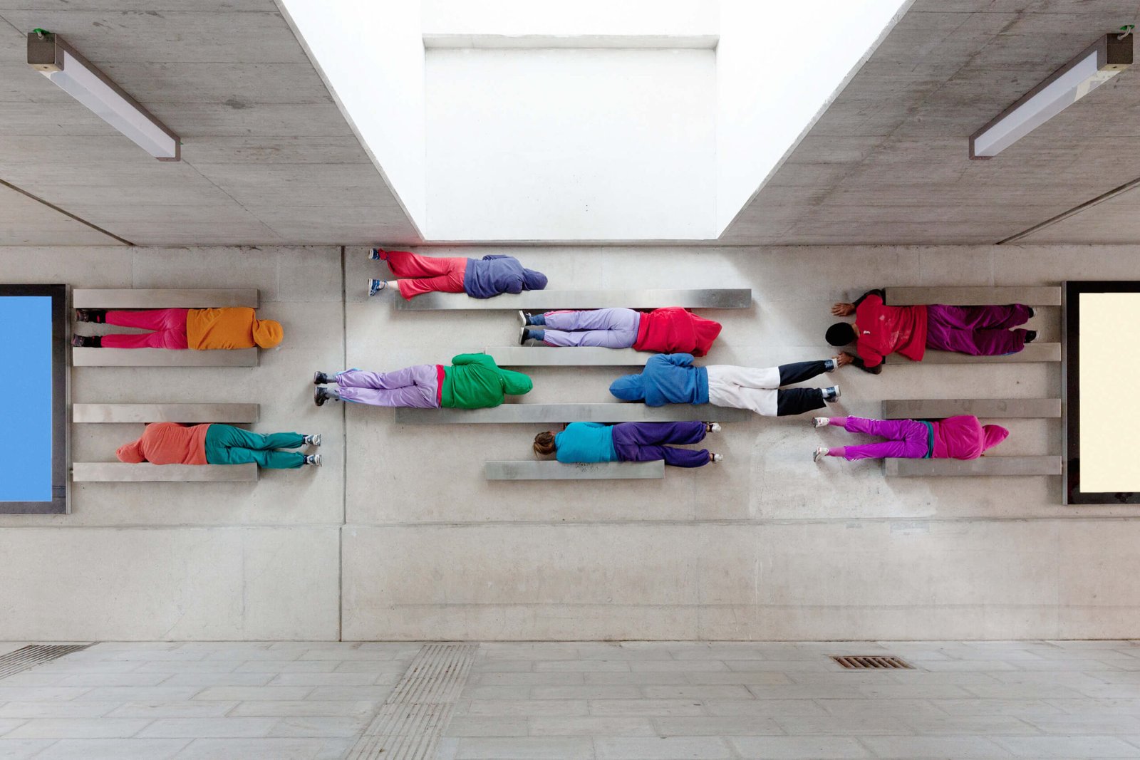 Willi Dorner is an artist and choreographer. Lisa Rastl is a photographer. They are married and live in Vienna, Austria. Since 2006, they have been engaged in a project called Bodies in Urban Spaces, site-specific performances for groups of dancers that lead audiences on meandering processions through the streets of various cities. Along these trails, the dancers, who wear brightly colored sweatsuits, interact with features in the built environment. They use porticoes, awnings, balconies, thresholds, windows, railings, and light posts in ways that their shapes might suggest to the body, but for which these implements were certainly not intended.