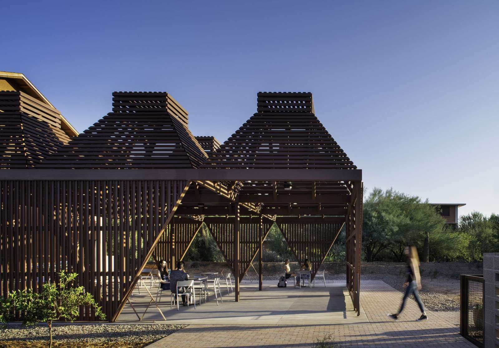 With these constraints in mind, our team made decisions about the design of the building including the variation of the façades, the spacing of screen members, and the geometry of the roofs and columns. The resulting project is a permeable building, resistant and adapted to the climatic conditions of the desert, and open to multiple uses.