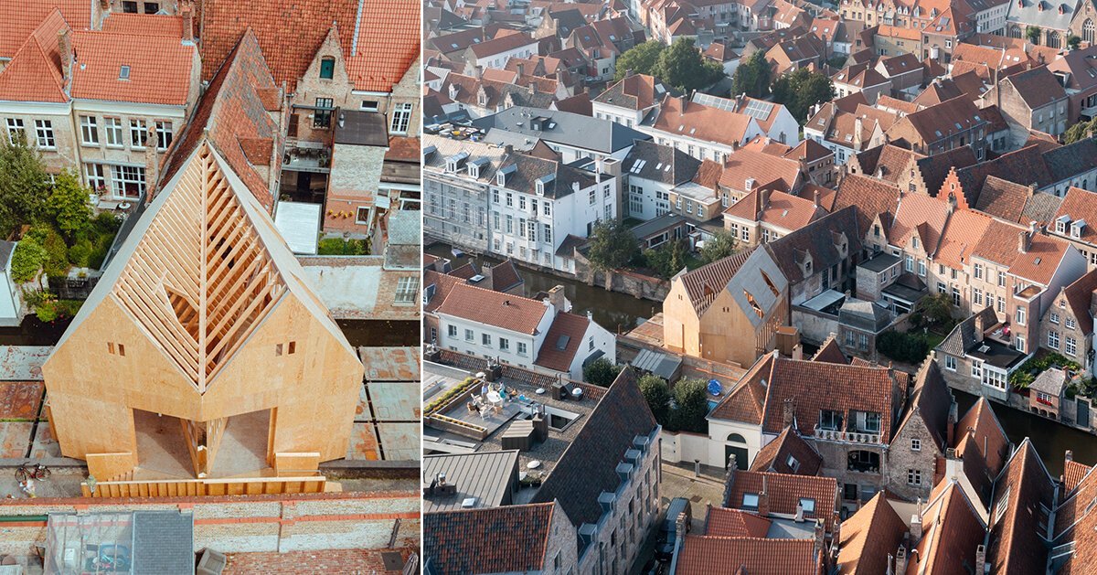 ‘brugge diptych’ takes shape as a wooden temporary pavilion conceived by PARA project for the 2021 brugge triennale in belgium, addressing issues in urban trauma. although the structure seems to have a typical gable silhouette that discreetly blends into the surrounding morphology, with a second glance from proper angles, passers-by can recognize its uncanny form; a roof that splits into two interwoven structures.