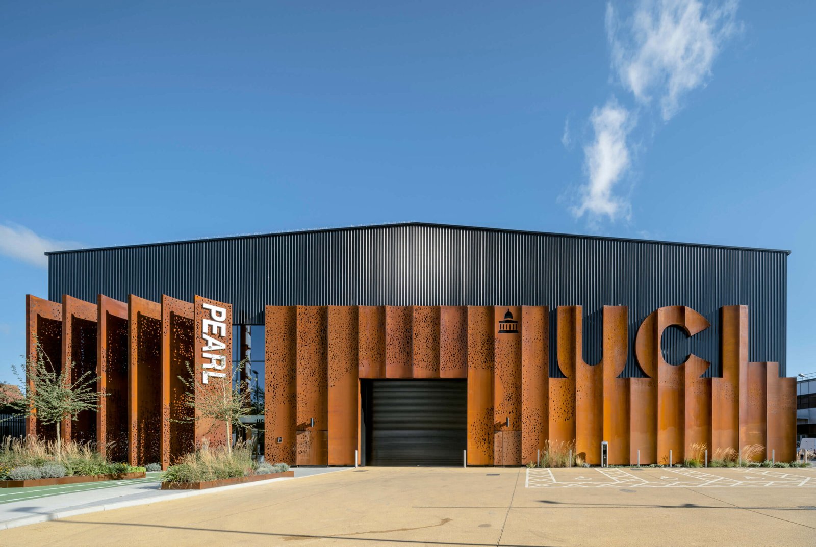 Designed by Penoyre & Prasad, a studio of Perkins & Will, the 43,000-square-foot PEARL is composed of a longspan steel structure for the lab, and a two-story cross-laminated timber (CLT) structure for a wing called The Groove that includes a lobby, workshops, and academic workspaces. A series of scalloped and perforated Cor-ten steel panels on the exterior, arranged on the results of a crowd flow analysis, adds interest and references the subject of study that will take place inside the lab. The rusted steel skin serves as an appropriately warm welcome for the industrial nature of the building, peeling back graphically to reveal a corrugated black metal base layer.
