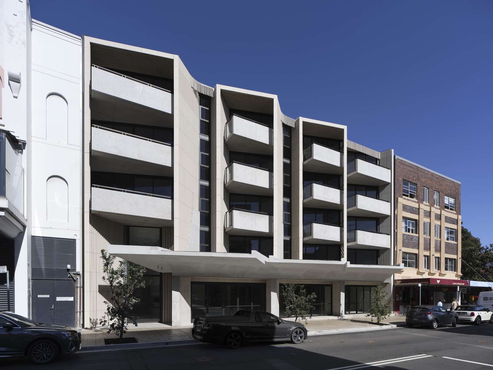 The arrangement of the street balconies, screens, and intermediate bedrooms creates the architectural expression of the building with white terracotta battens which are arranged vertically to form a rhythmic series of tall portal frames that enclose the balconies. Its sculpted form, which has its vertical emphasis, marries the predominant art deco style of the historic building and draws connections with its rugged coastal location. The natural terracotta provides a fine-grained scale and tactility against the off-form concrete balconies.
