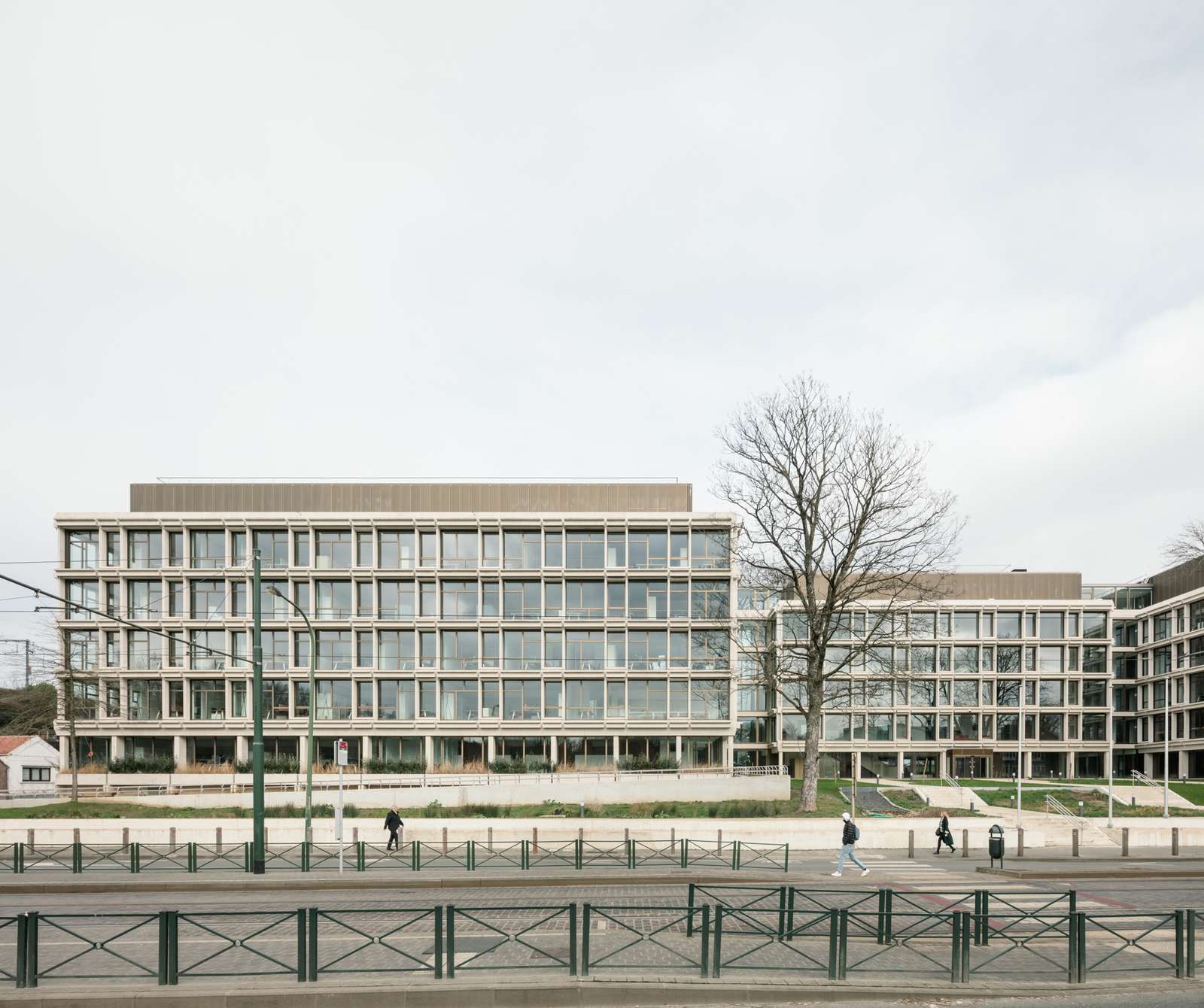 The architectural interventions are subtle and respectful while creating a contemporary identity. The rigorous expression of the building’s structure is preserved. Different window patterns create a link between the floor levels and offer a lighter reading of the façade. For heating and cooling, we have developed with Vivaqua, the public distributor of water in Brussels, a pilot project that uses riothermia: energy derived from wastewater, optimally utilizing existing energy flows and the specific local conditions of the site.