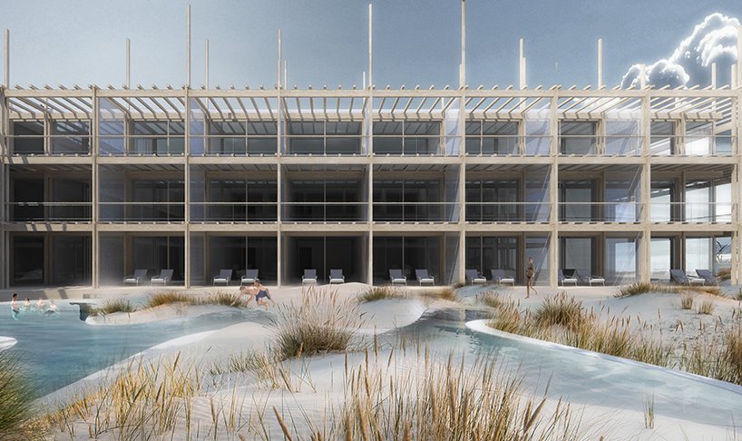 situated on the greek island of lefkada, the dunes individual beach hotel is an innovative hospitality proposal that combines coastal landscape features with new architectural design. led by georges batzios architects, the project responds to local urban development by attempting to rectify it. ‘since the 1976 earthquake, lefkada’s cities followed an unruly urban and architectural development with no respect to nature nor to the contemporary human needs. our proposal aims to restore the relationship between the local natural environment and the new hotel architecture,’ explains the firm. in other words, a hybrid landscape is envisioned by bringing together the artificial and ecological — allowing luxury, ecosystems, and biodiversity to coexist equally.