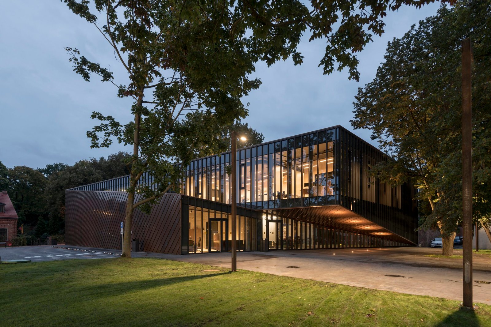 A museum dedicated to Lithuania’s most celebrated sport, the House of Basketball, stands at the meeting point of Kaunas Old Town and Santaka Park. The building marks the edge of the historic quarter while presenting a clear contemporary form. Its curved volume wraps around a century-old oak tree, which becomes the spatial anchor of the project. A small courtyard forms at this center, guiding visitors toward the entrance.