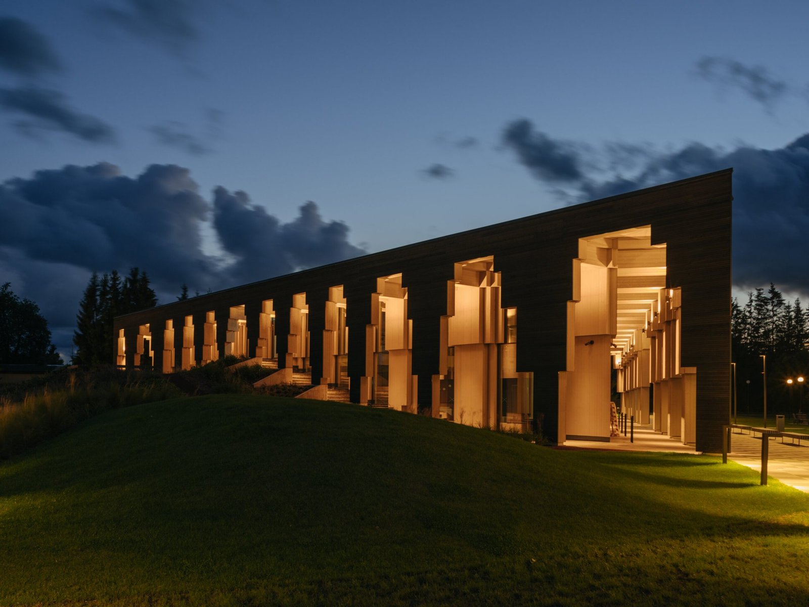 A concert hall more than a century in the making, Great Amber finally opened in Liepāja in 2015. The monolithic, cone-shaped volume leans slightly, conceived as a response to the city known as the birthplace of wind. Its translucent amber façade wraps an irregular concrete structure, forming a protective envelope around the performance spaces within.