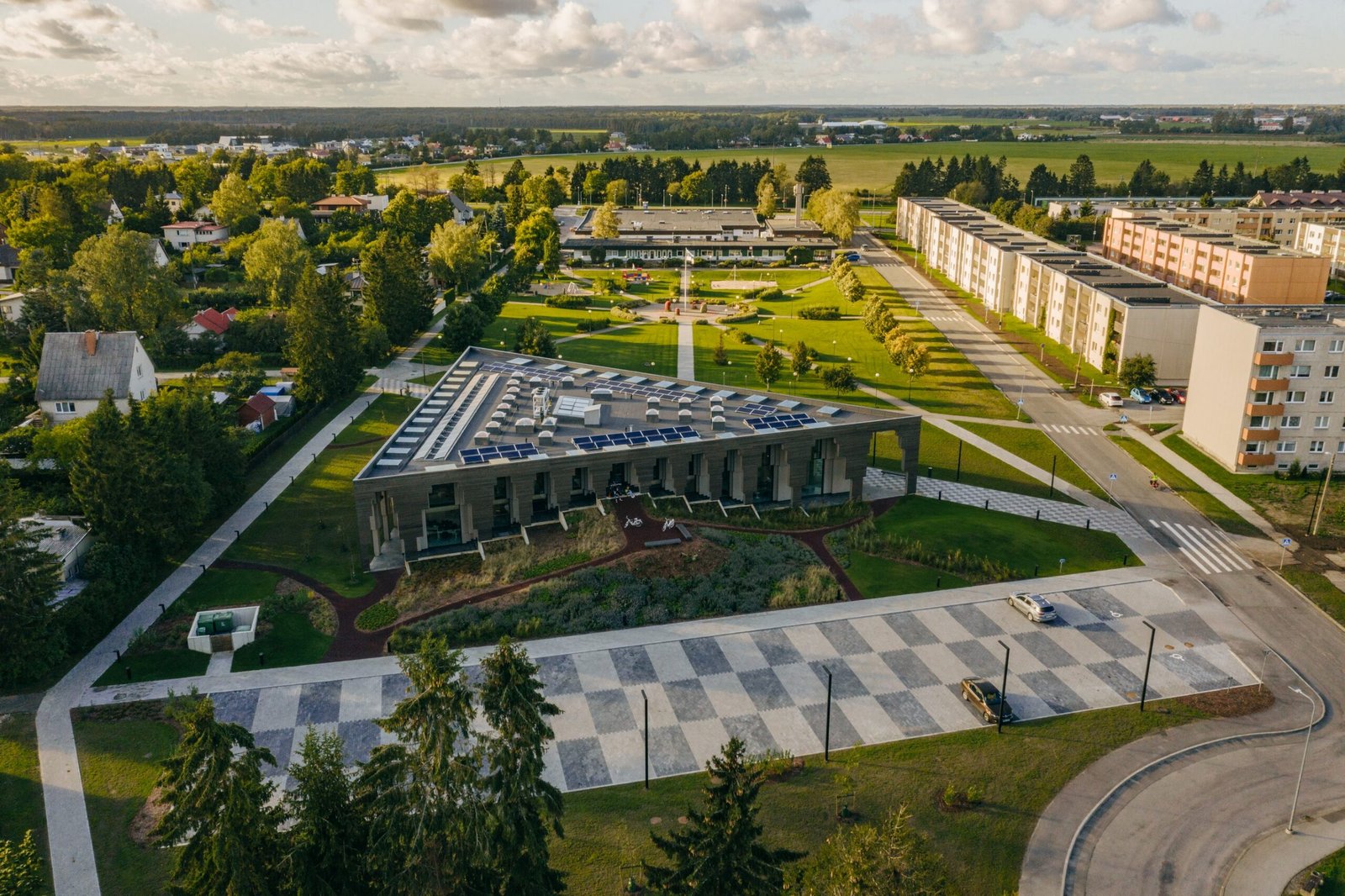 Set at the edge of Saue’s central park, the rural municipal building closes the green space with quiet authority. From a distance, it reads as a pavilion. A carved archway cuts through the triangular volume, marking the entrance while offering shelter to passersby. A double-skin façade protects the workspaces within, balancing openness and privacy.