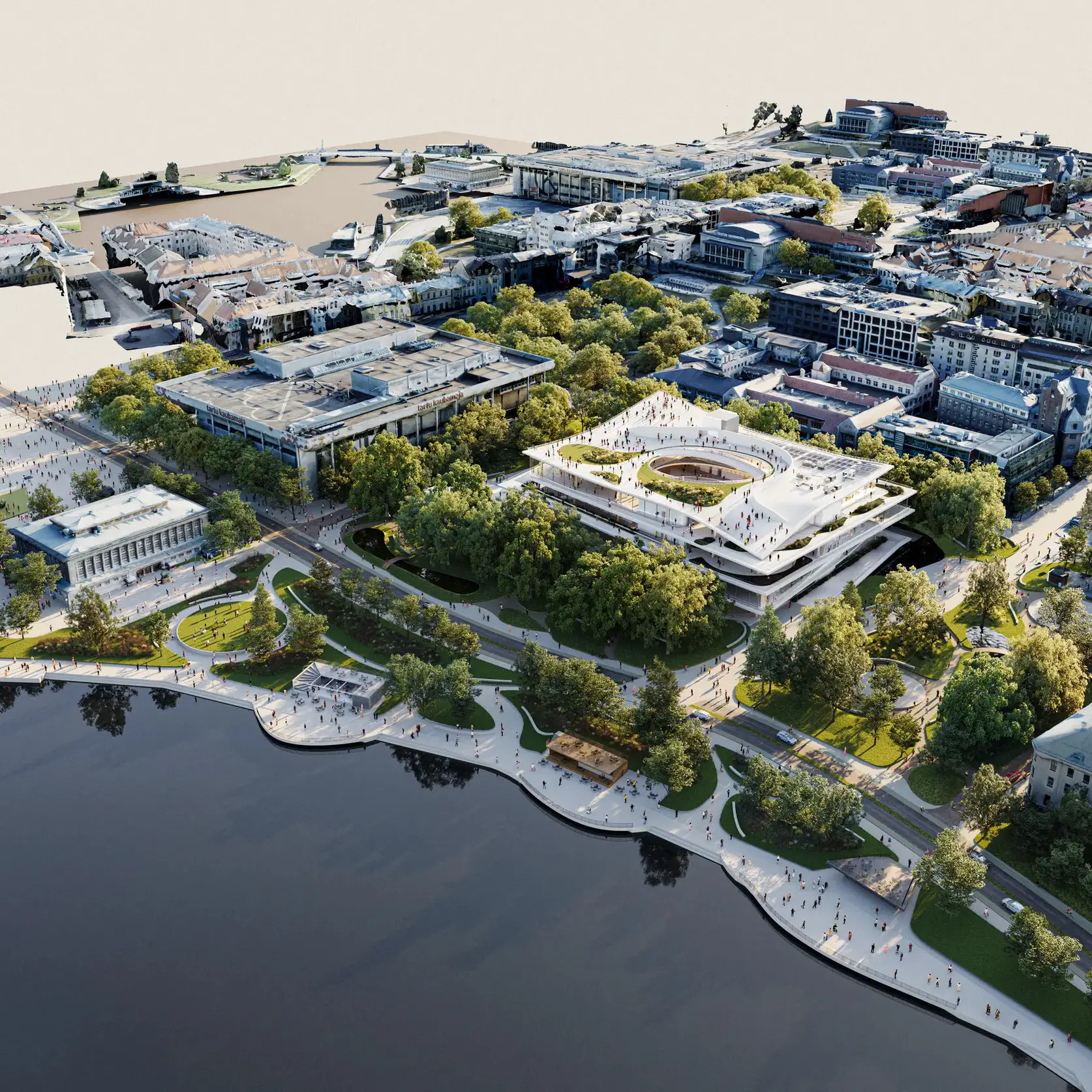 Each level is conceived as a spatial interpretation of one of Estonia’s five national park landscapes. Undulating floor plates circle an open courtyard and connect through a continuous ramp, guiding visitors upward through museum spaces, a library, a cinema, and restaurants. A rooftop park would frame views over the city, completing a gradual ascent from river to skyline.