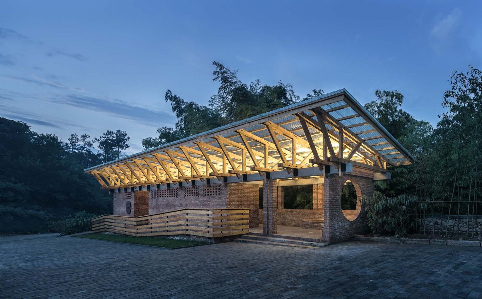 The wall of the building is clear water red brick, which is the most common and convenient construction material in rural areas. The continuous and repetitive wooden structure roof can realize the low-cost and fast production process. The roof is covered with fiberglass tiles, which allow sunlight to pass through the translucent fiberglass tiles, providing abundant natural light to the toilet.