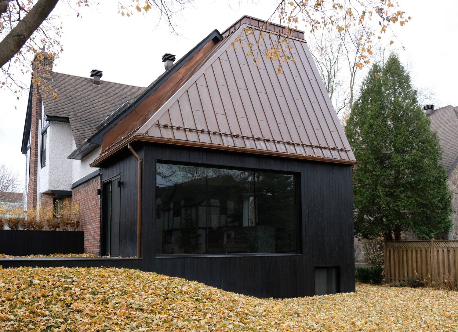 By working behind the sightlines of the front façade, where the city’s regulatory framework is more permissive, Atelier Barda was granted greater freedom in their choice of materials. The firm opted for the nobility and functionality of custom-cut copper panelling for the rear extension’s roof, as opposed to the traditional asphalt shingles of the existing structure. Below the copper roofing, the design team applied burnt wood cladding, providing a natural protective layer against the elements.