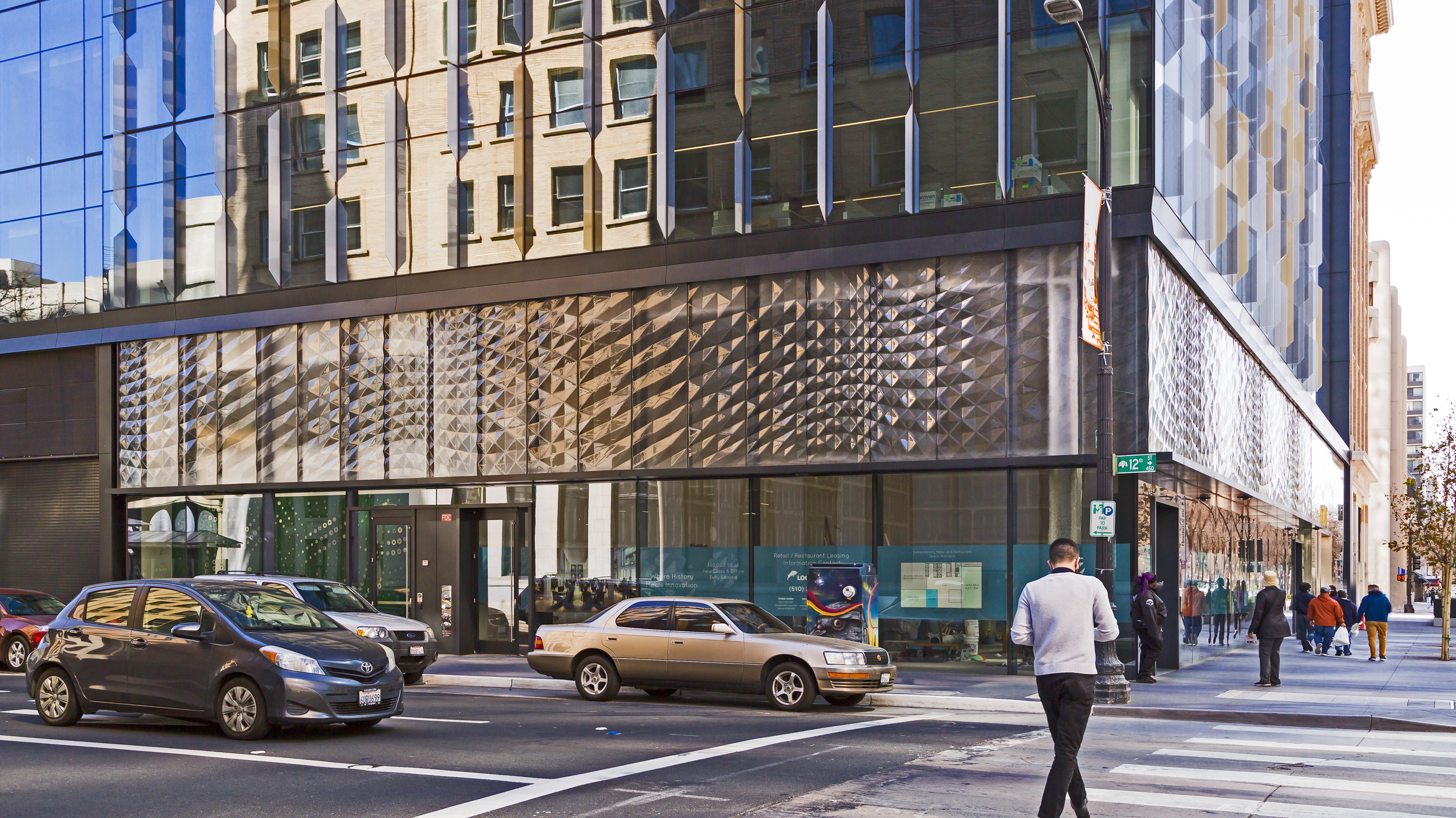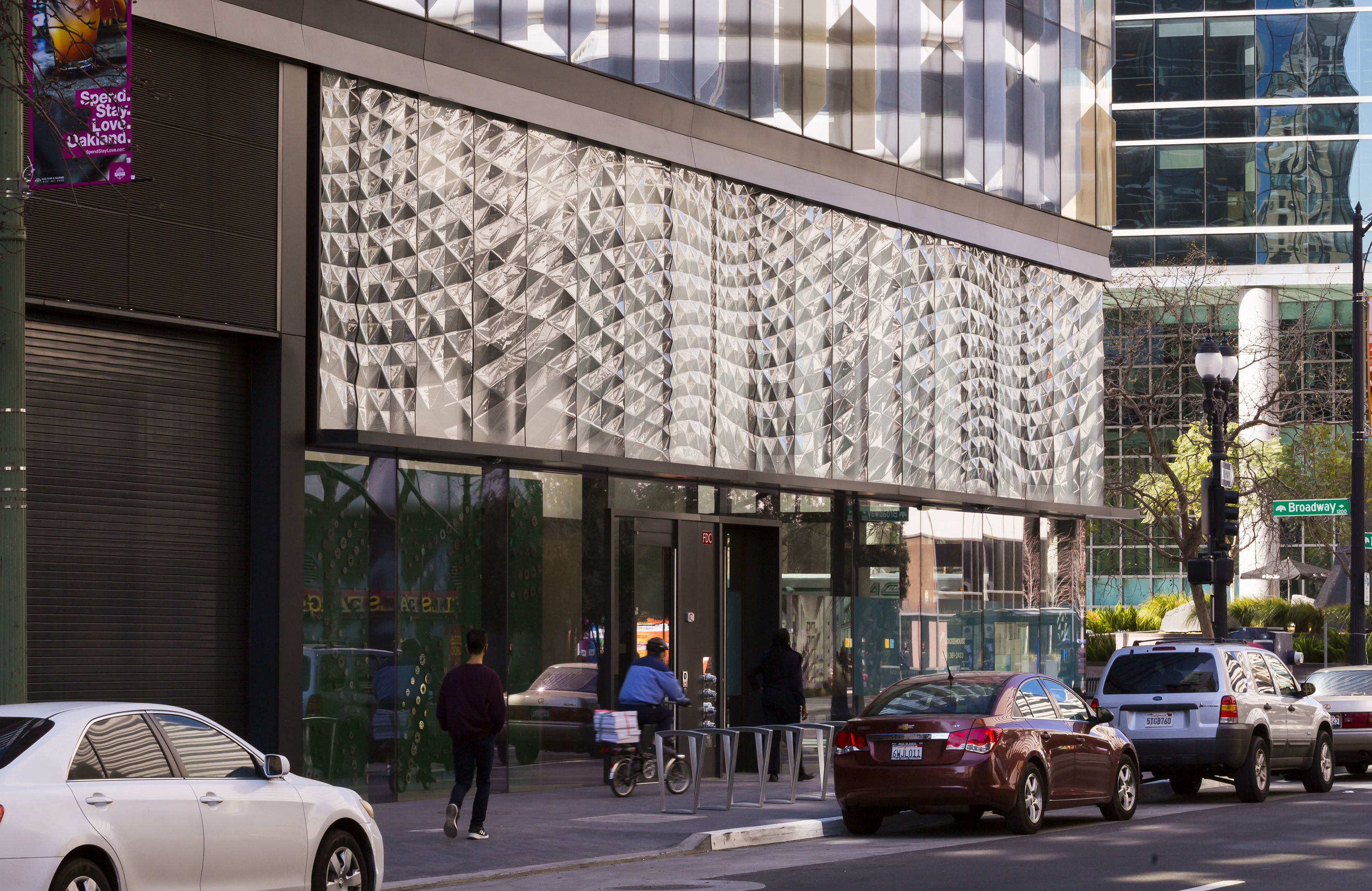 In 2017, Ellis Partners decided to restore the Key System Building and connect it to a new high-rise. In response to a public art ordinance, the architects and developers designated a band of glass above the sidewalk as the site for our work.The site was a north-facing seventy-five-foot-long glass wall plus a west-facing ninety-five-foot wall.
